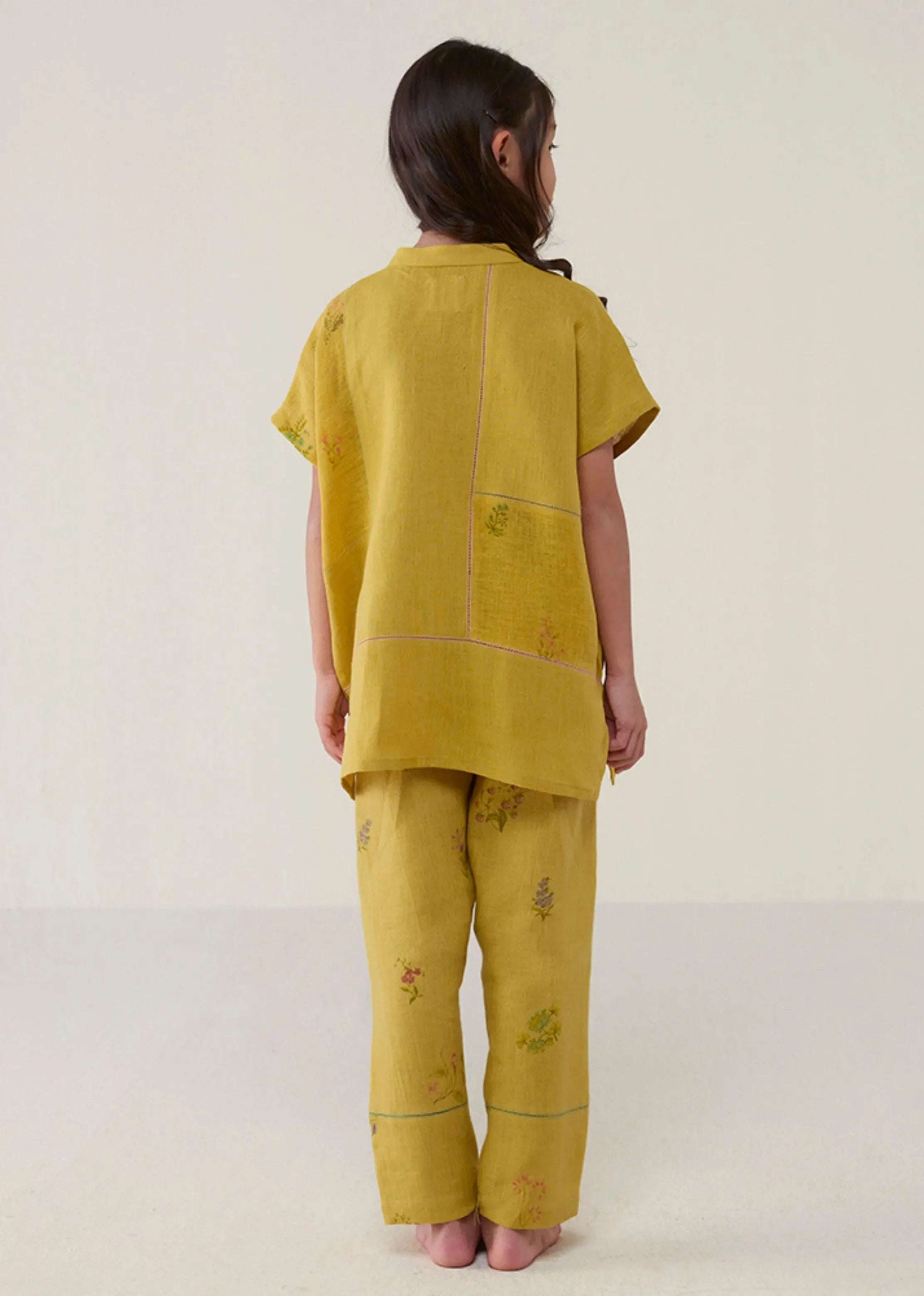 Top - A flowing patchwork shirt crafted via patchwork of our signature soft yarn-dyed linen and sheer linen, featuring an intricate hand-painted floral print. Enhanced with multi-coloured fagotting stitch on adjoining patches. Bottom- Our forever favourite tapered pants with pockets, an elasticated back waistband designed in our signature soft yarn-dyed linen with a hand-painted multi-coloured floral print finished with a faggoting stitch in a pop-coloured thread.