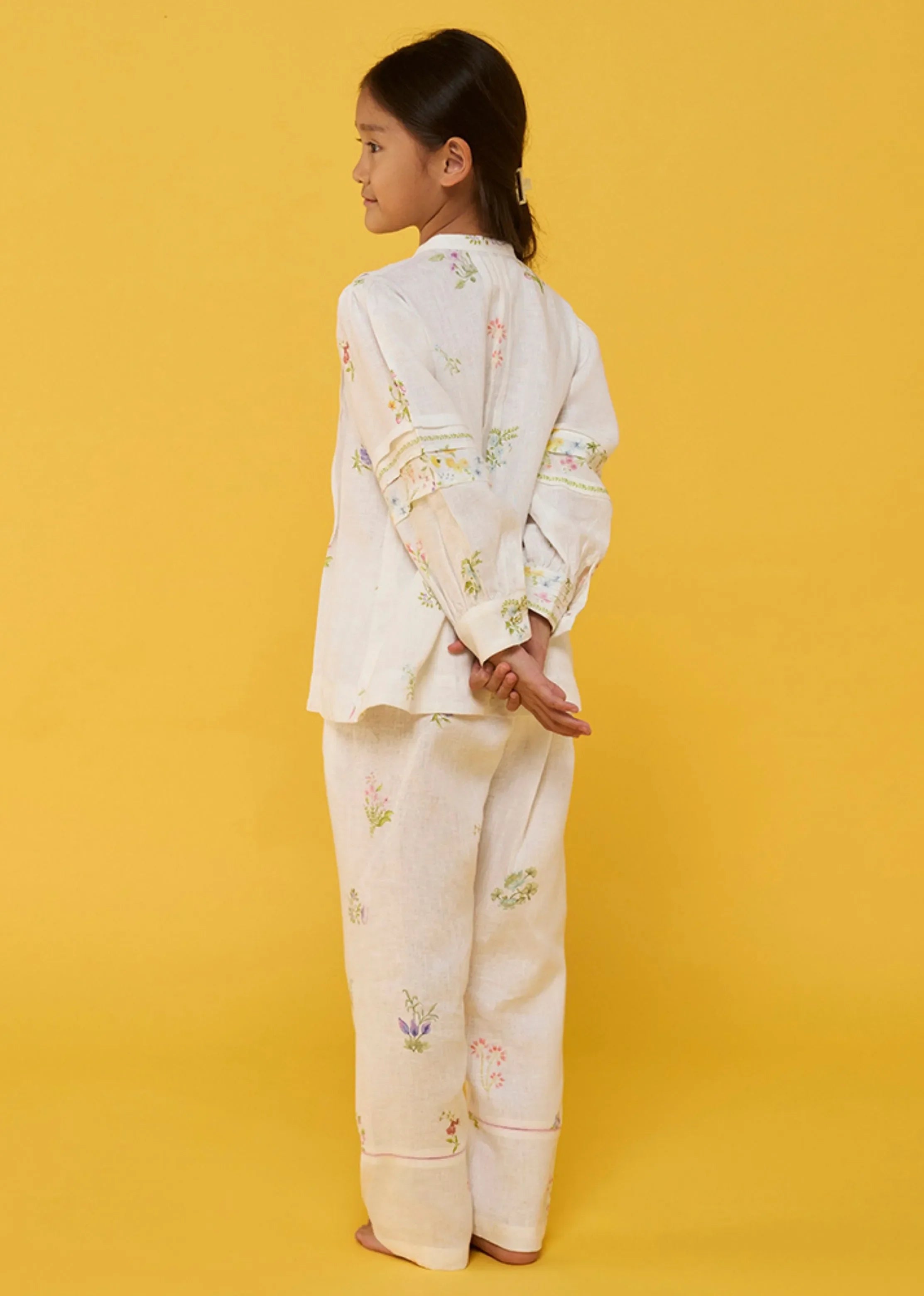 Top - A hand-pleated mandarin collared shirt that you can wear everyday with tapered or flared pants, Akavi is crafted from our signature soft yarn-dyed linen, featuring a delicate hand-painted multi-coloured floral print. The shirt is finished with pintuck details on the floral border printed cuff with pleats in the sleeves, linen fabric buttons and mother of pearl buttons. Bottom- Our forever favourite tapered pants with pockets, an elasticated back waistband designed in our signature soft yarn-dyed linen with a hand-painted multi-coloured floral print finished with a faggoting stitch in a pop-coloured thread.