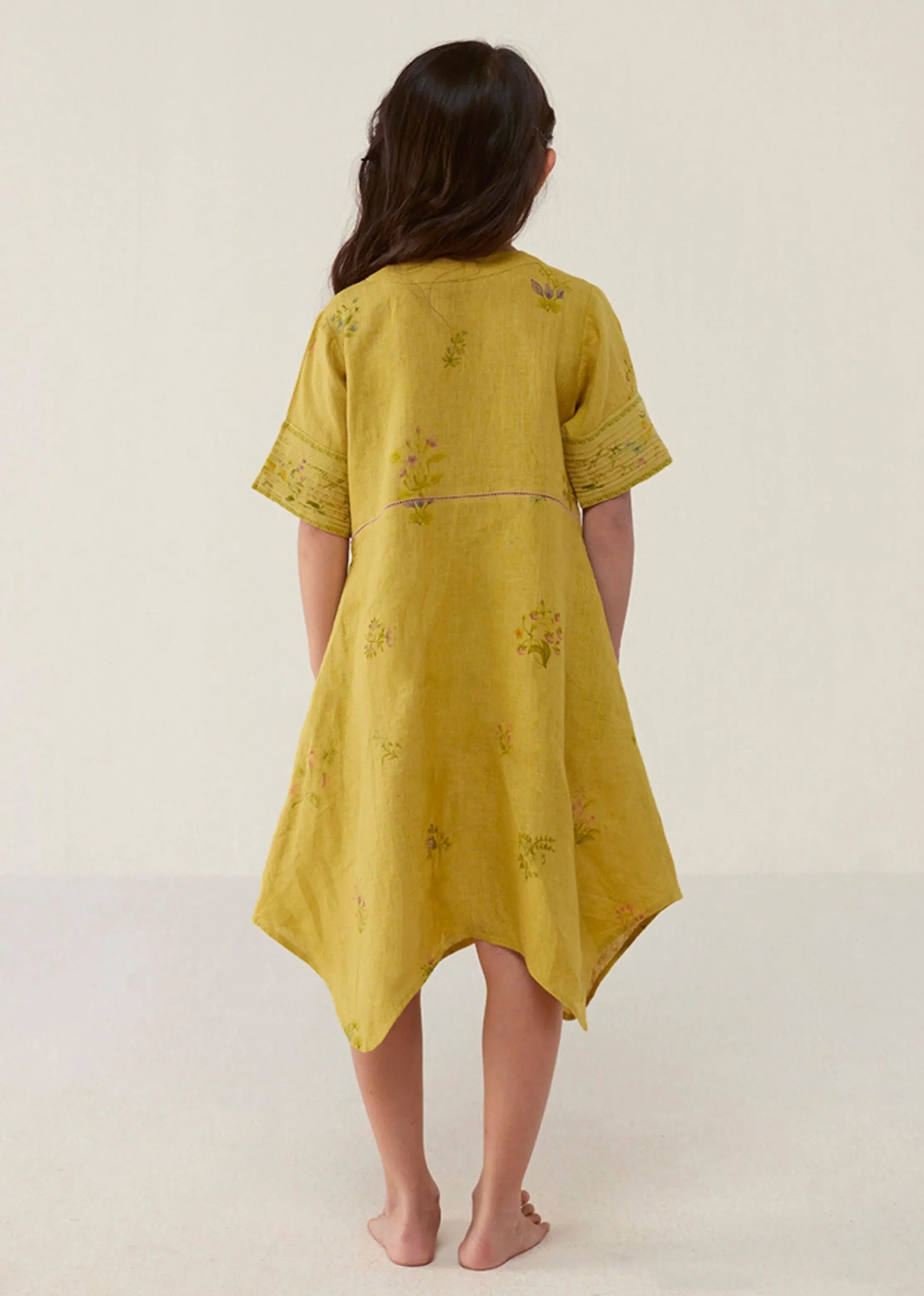 A distinctive button-down dress crafted from our signature soft yarn-dyed linen, featuring hand-painted delicate buta (motif) floral. Thoughtfully designed with an elegant up-and-down curved hemline, practical side pockets, and mother of pearl buttons.