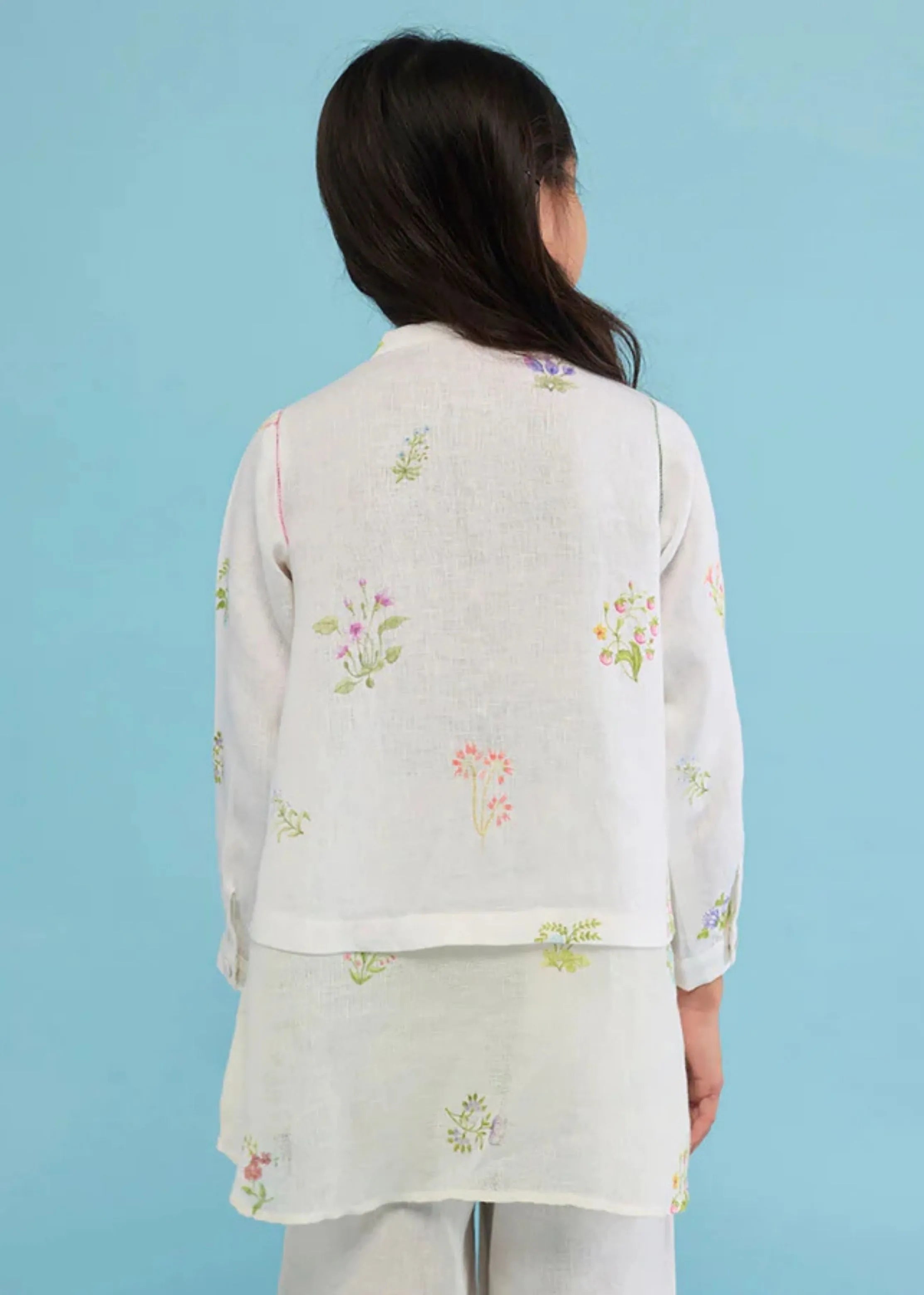 Top - A statement A-line shirt crafted from our signature soft pure linen and soft flowing sheer linen. Featuring a buta print, the shirt is finished with fabric buttons, colourful thread buttonholes and faggoting stitch detailing. Leina is perfect for evening gatherings and social events, offering both comfort and versatility. Bottom - Timeless linen culottes with pleats at the waistband, comfortable pockets and a soft elasticated back waistband in our signature yarn-dyed linen with a sheer linen patchwork band at the hemline with a tonal faggoting stitch detail.