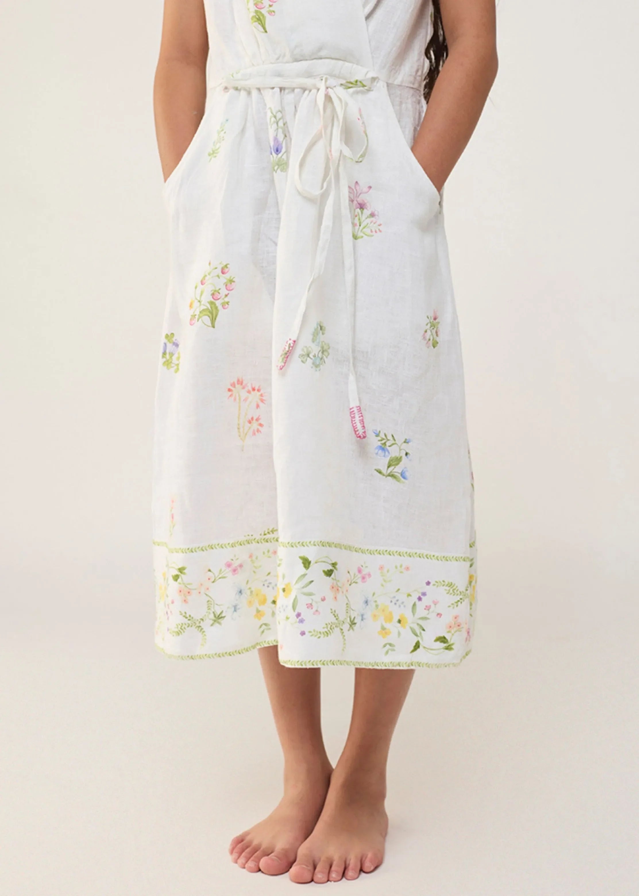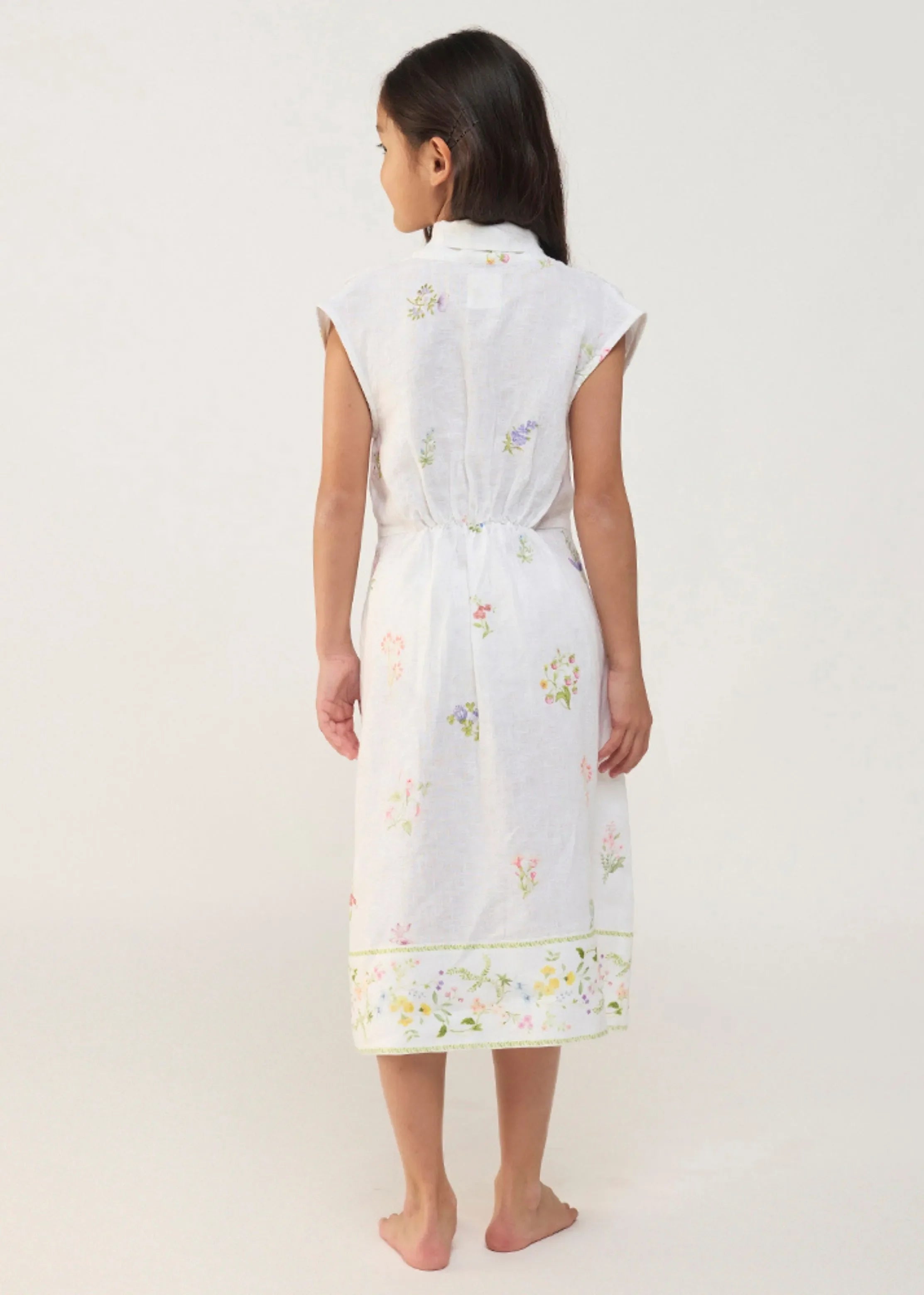 Our favourite contemporary shawl collar midi dress is handcrafted from our signature yarn-dyed linen with a hand-painted floral print with gathers at the waist. The Mema Dress is finished with a printed sheer linen border at hem, pockets and has blanket stitch detailing on the edge of the belt. We love the Mema dress for its versatility as it's easy to dress down or up.