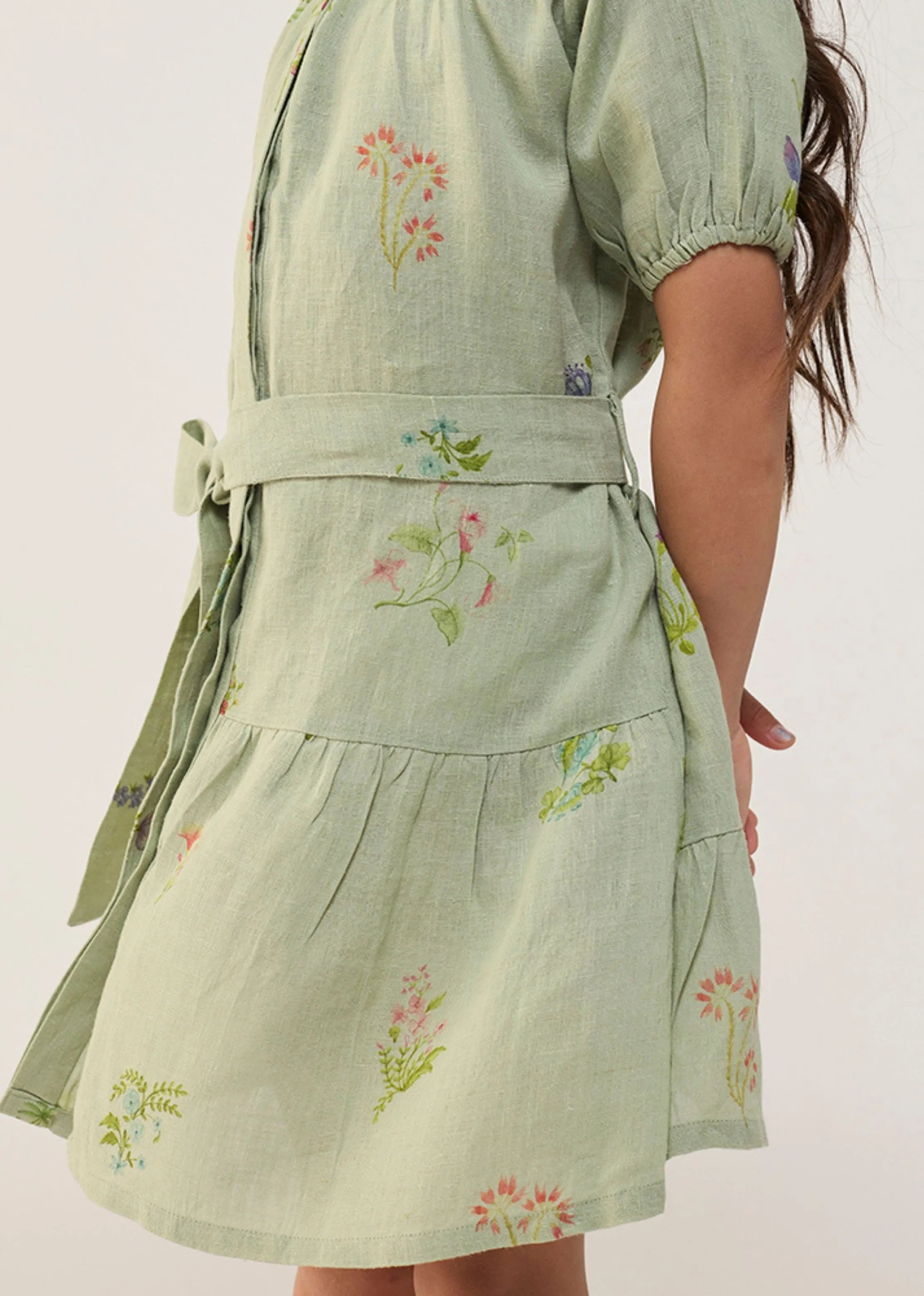 A summer panelled dress designed from a thoughtful floral printed yarn-dyed linens. Pockets and a border floral print at the back and side panels. A floral printed linen belt is included with the dress.