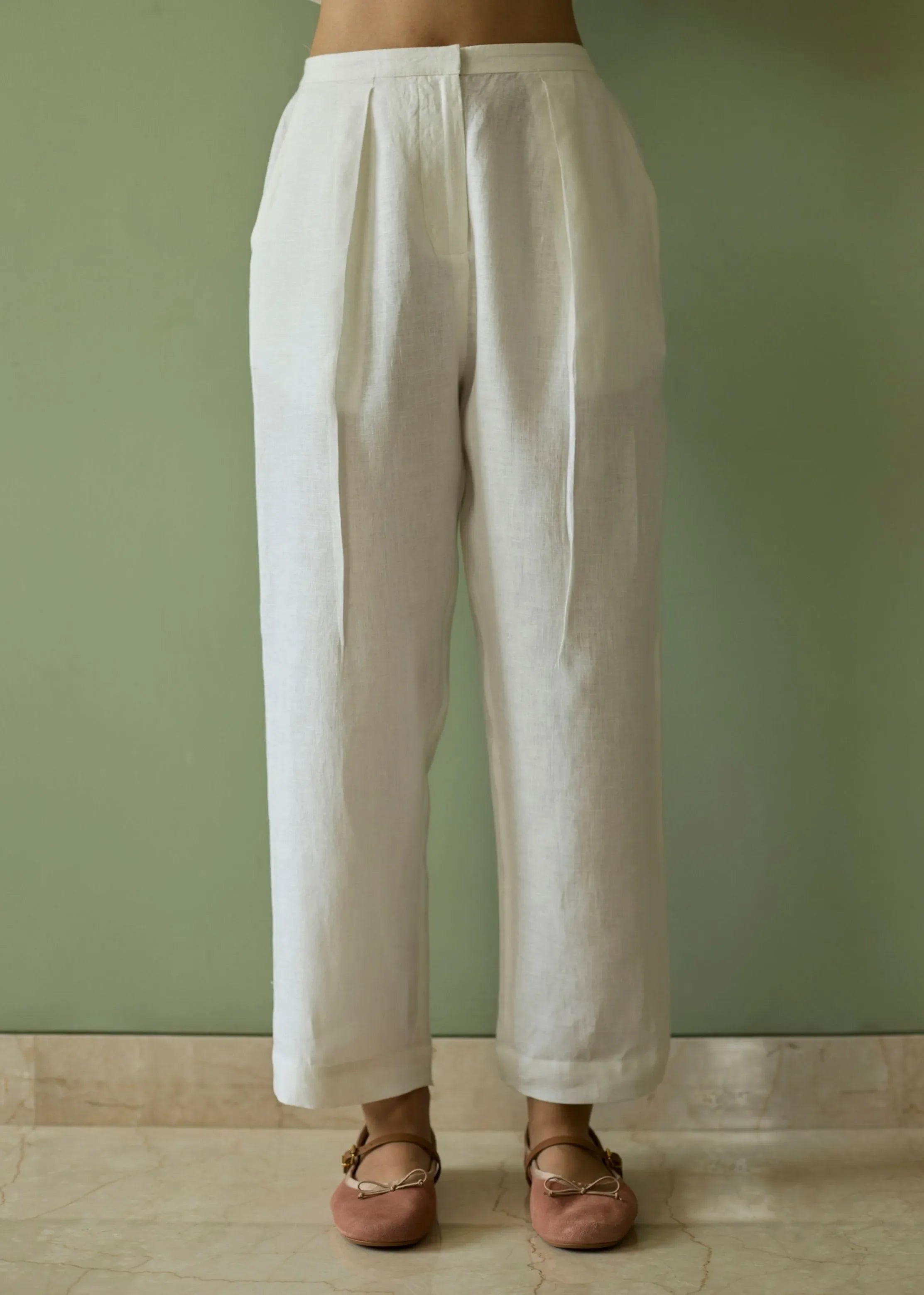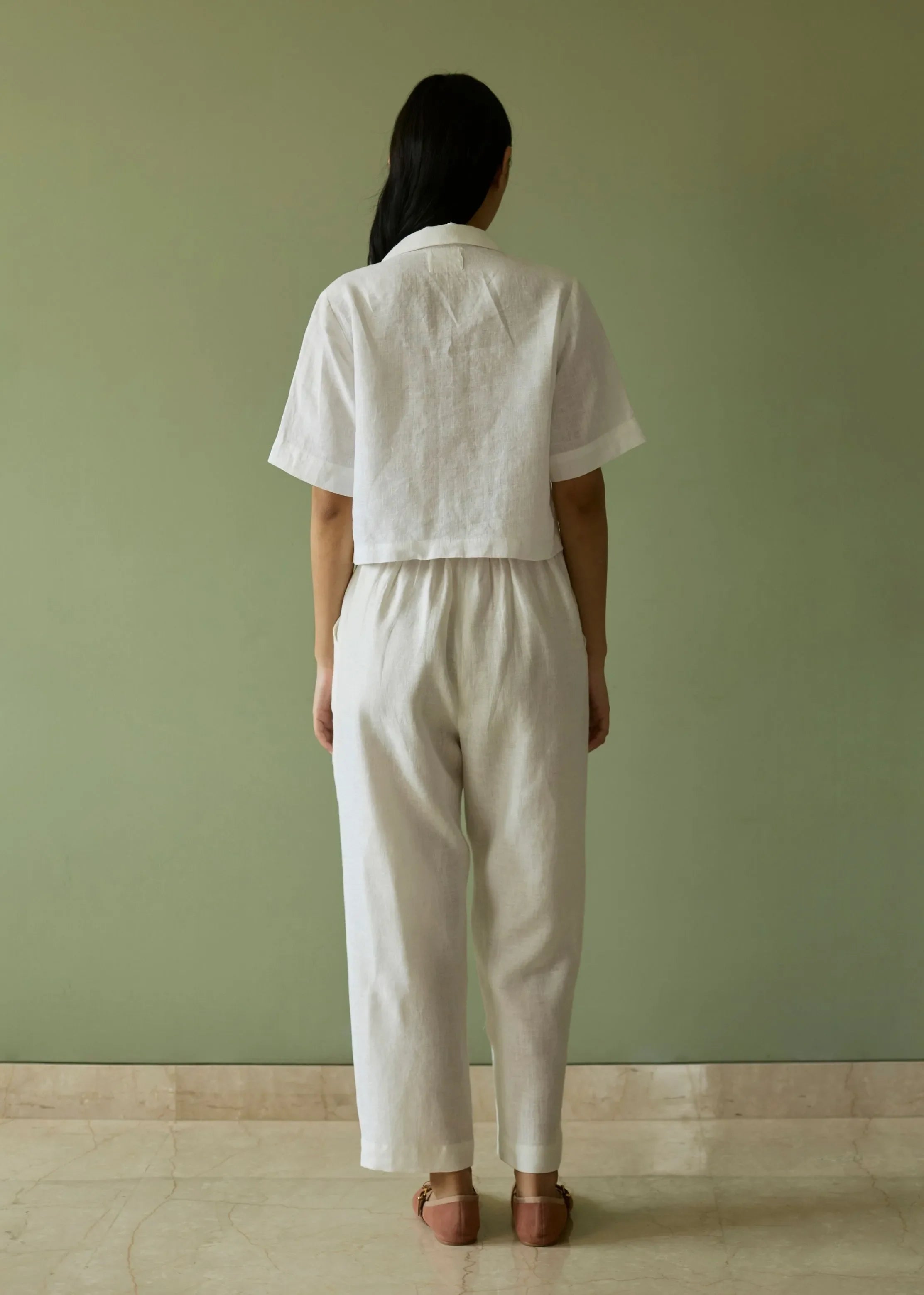Top - This stylish cuban collar cropped shirt is crafted from our signature ivory linen. Designed with short sleeves, the Kiera has a clean and contemporary silhouette with statement mother-of-pearl buttons. Pant- This relaxed tailored pleated pants is crafted in our handwoven ivory linen with a front zipper, hook opening, pockets, an elasticated back waistband for comfortable fit.