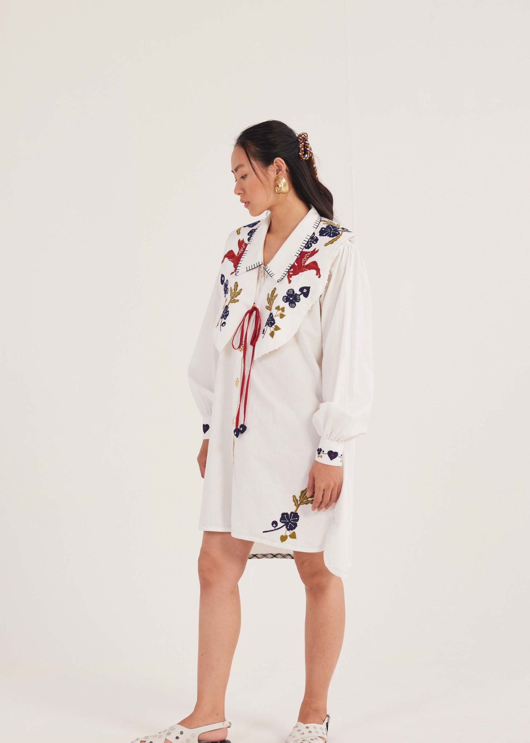 Our Kiji shirt dress is relaxed enough for vacation dressing but casual enough to do, well, anything else. It features an asymmetrical hemline with an under hem detail, charming detailed embroidery on the back, hem and cuff. Handmade kaaj detail. This collar bib is crafted in soft cotton with playful appliqué detailing.