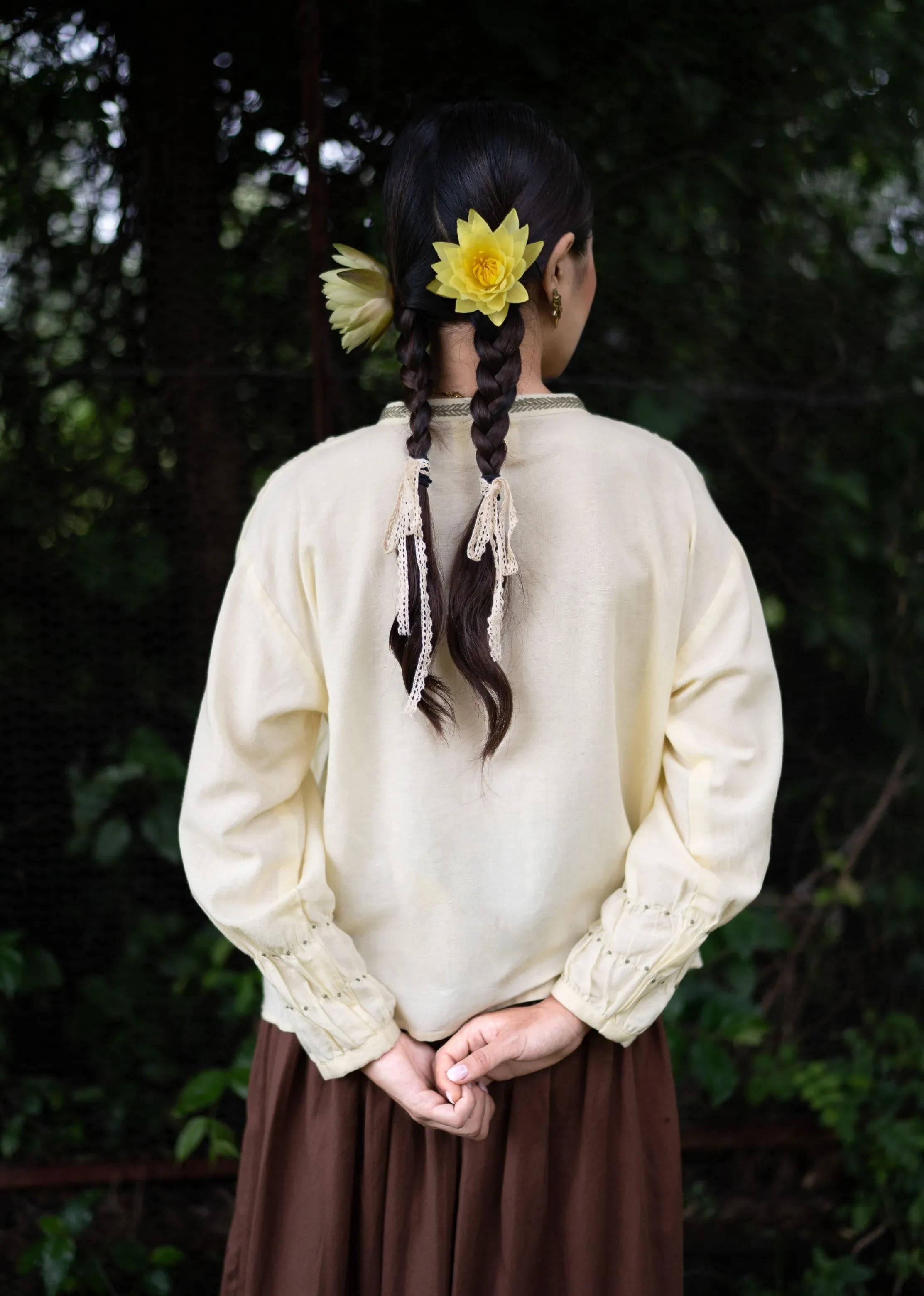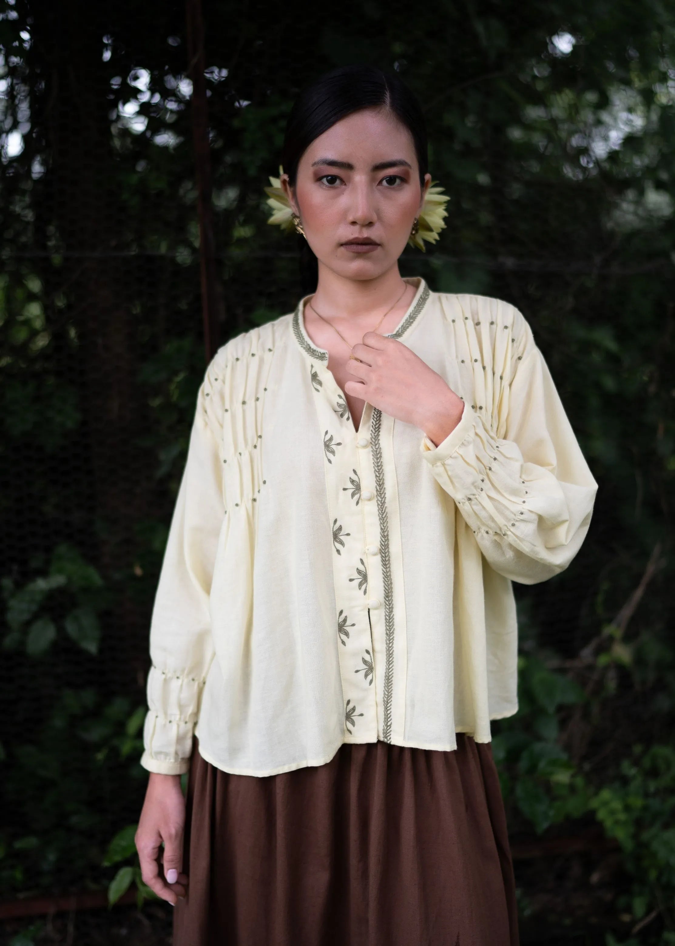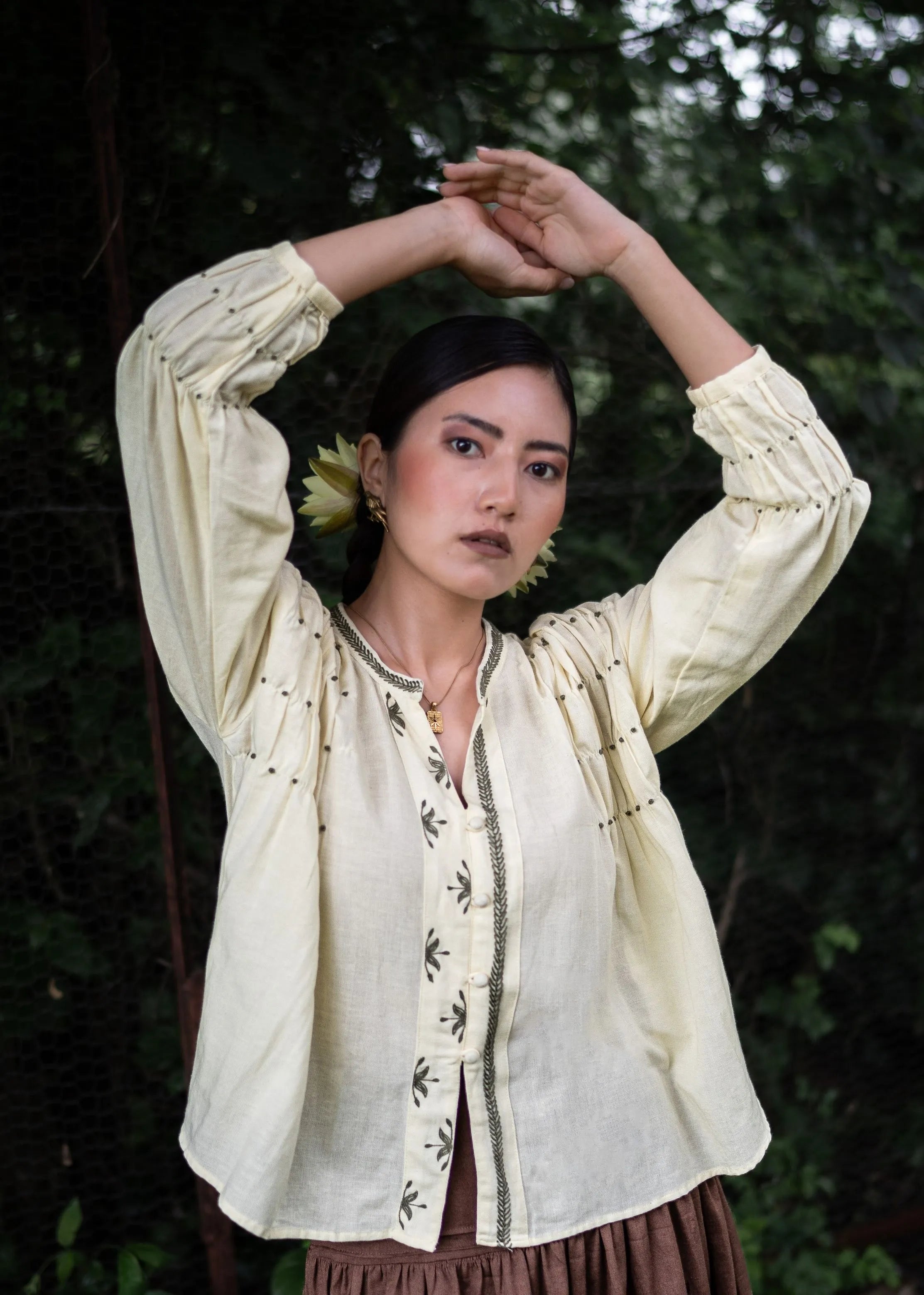 Breezy sophistication meets artisanal detail in this oversized, relaxed-fit top. Crafted from luxuriously soft linen in a warm butter yellow hue, it features a refined band collar and delicate hand-embroidered knot all over the sleeves and shoulders — a true celebration of craftsmanship. The front placket is adorned with delicate beautiful embroidery. Effortlessly paired with a mocha brown skirt, it creates a harmonious, elevated look perfect for a sunlit brunch or a leisurely weekend outing.