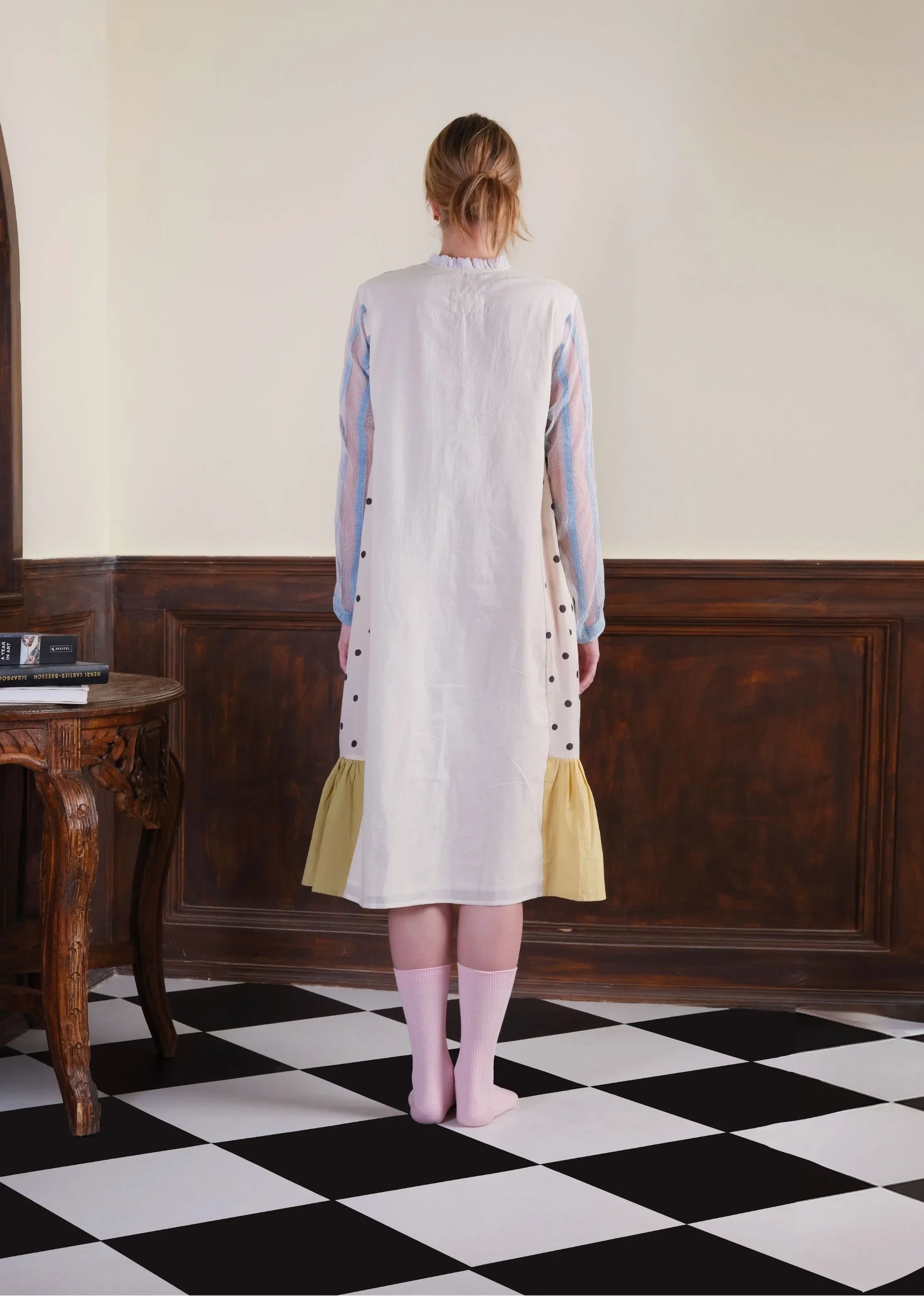 It is a multi-panel, button down, relaxed fitted dress with gathered high neck. Mixed-print is painted with kassim, pomegranate, myrobaln, alum, turmeric, madder, sappanwood and lac. It featured kota doria fabric with patch indigo sleeves and side gathers in pomegranate and myrobalan. The buttons are handmade using brass. Shell and lining made with 100% cotton.