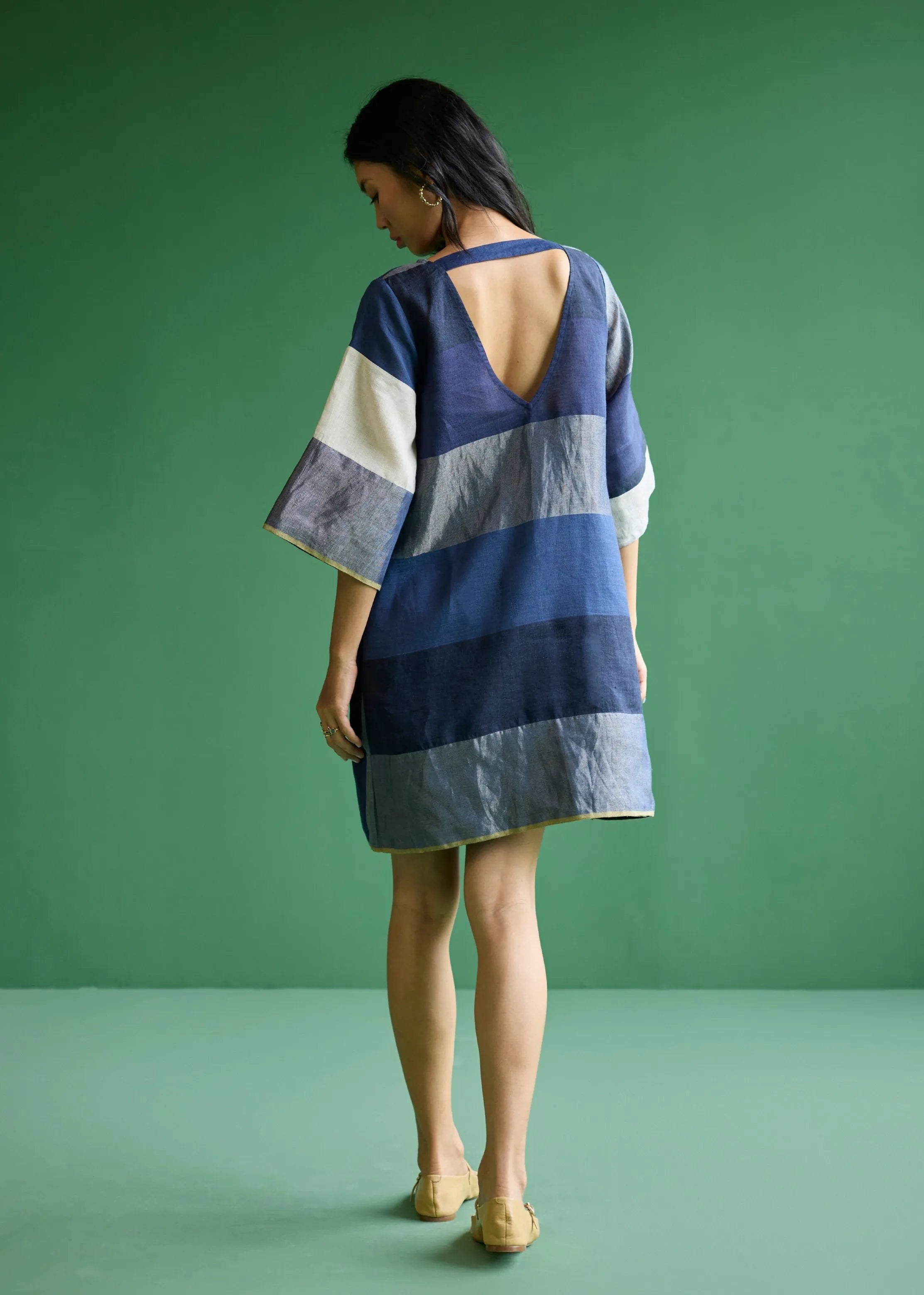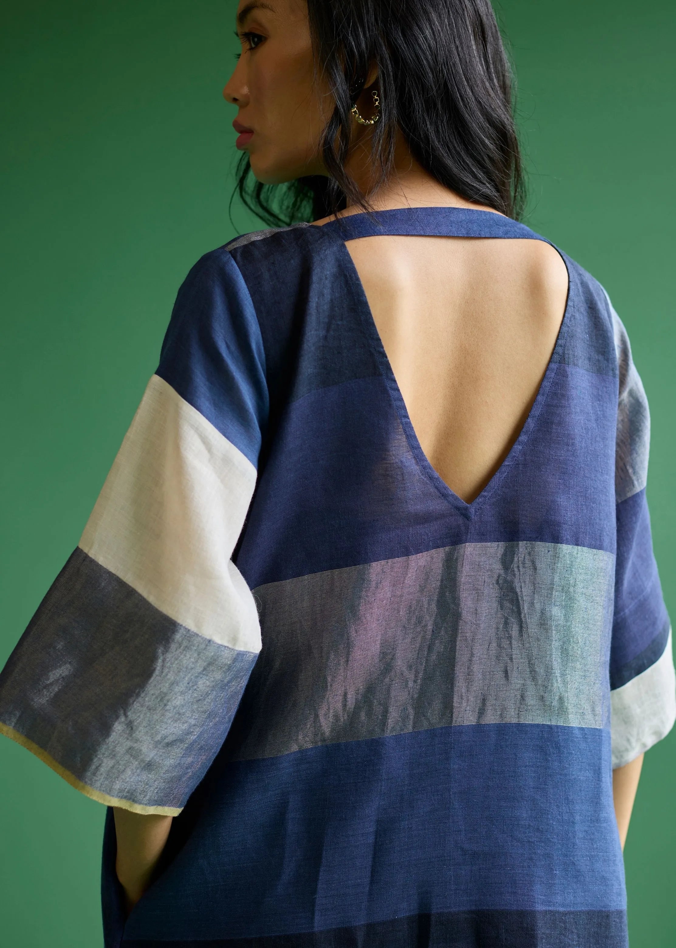 A thoughtfully color-blocked boat-neck dress designed using our signature yarn-dyed navy metallic linen and yarn-dyed ivory metallic linen weaves with a flattering low-back and 3/4th sleeves.