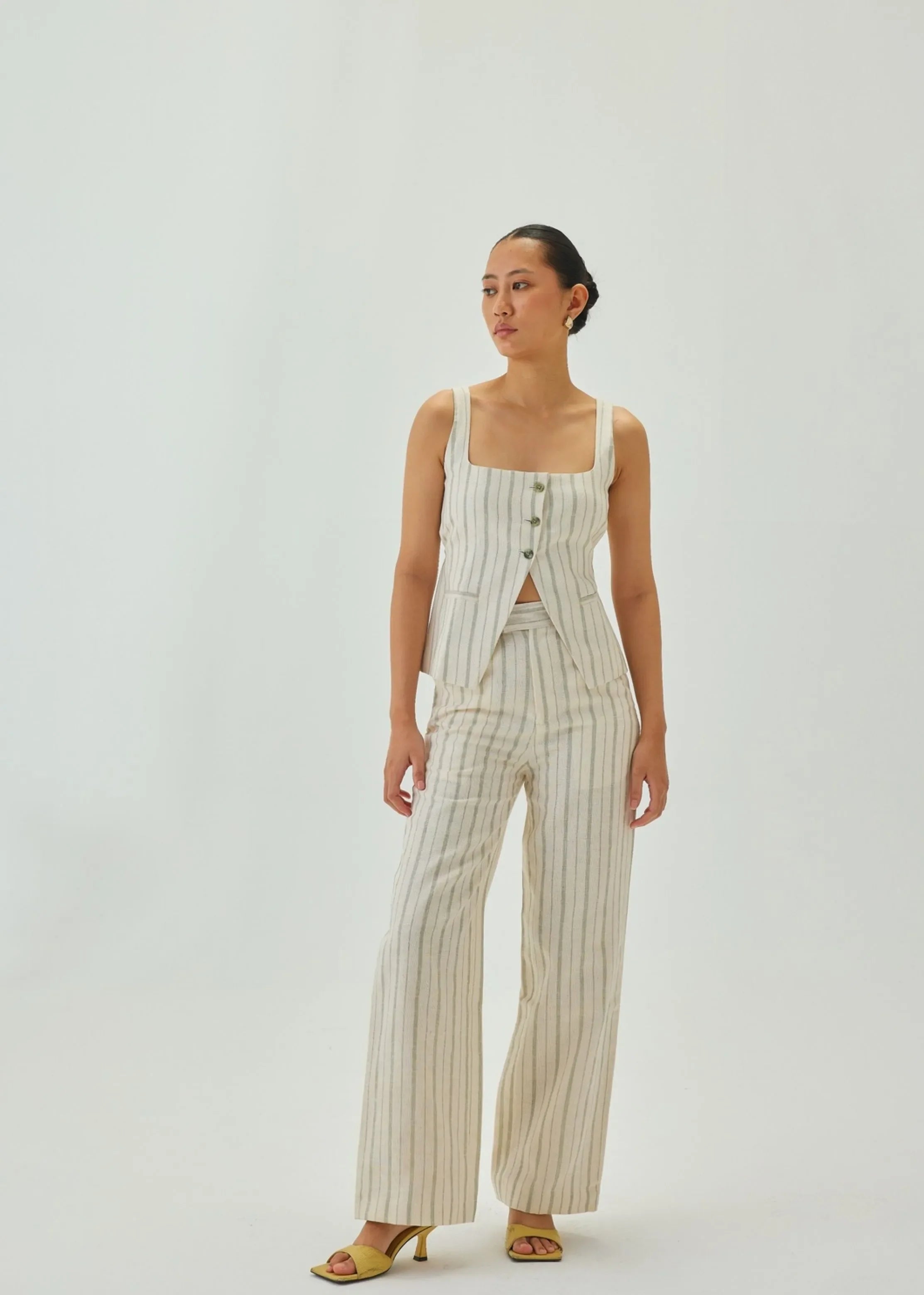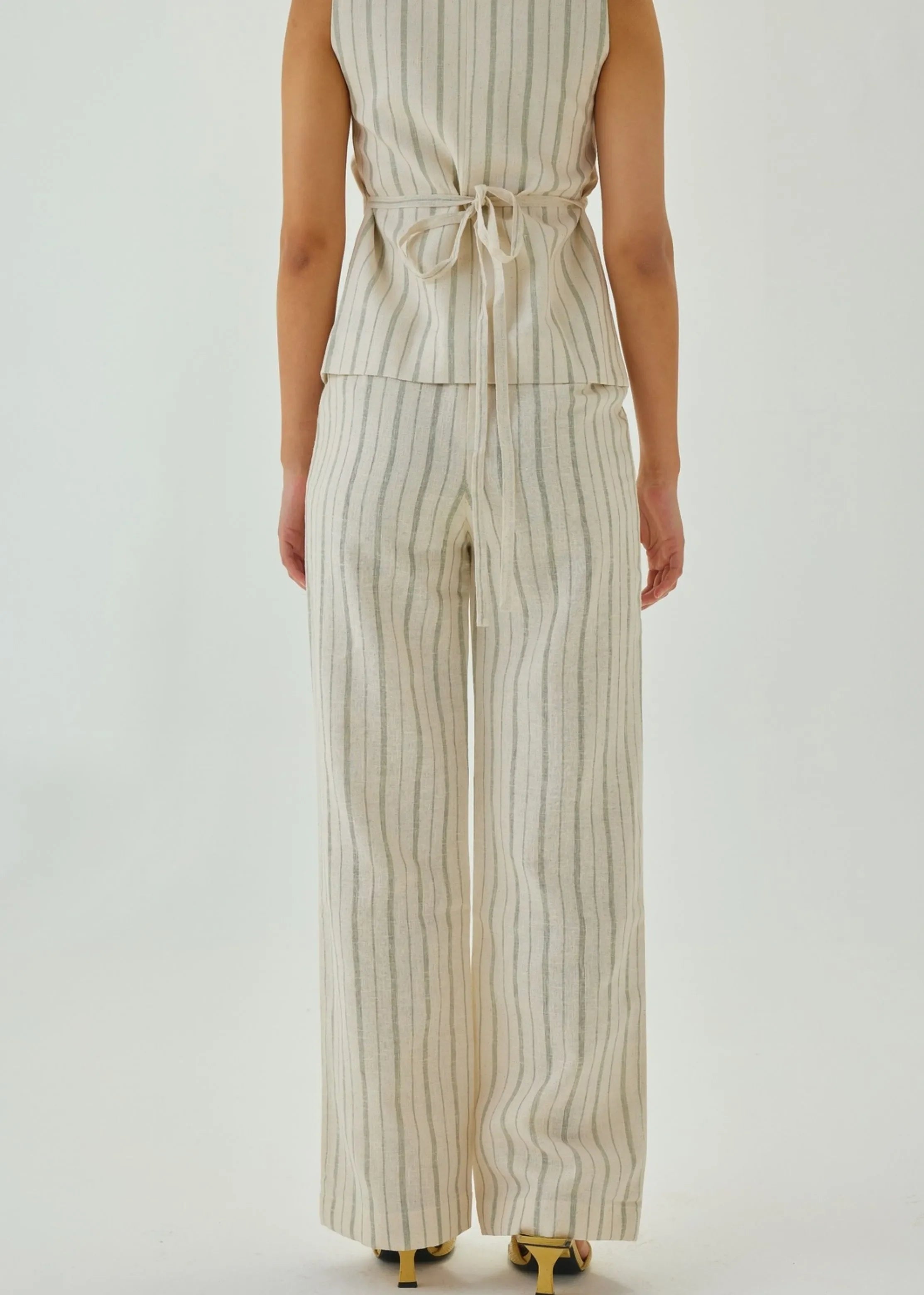 Linen striped high waist straight pants with overlapping belt and a metal hook fastening