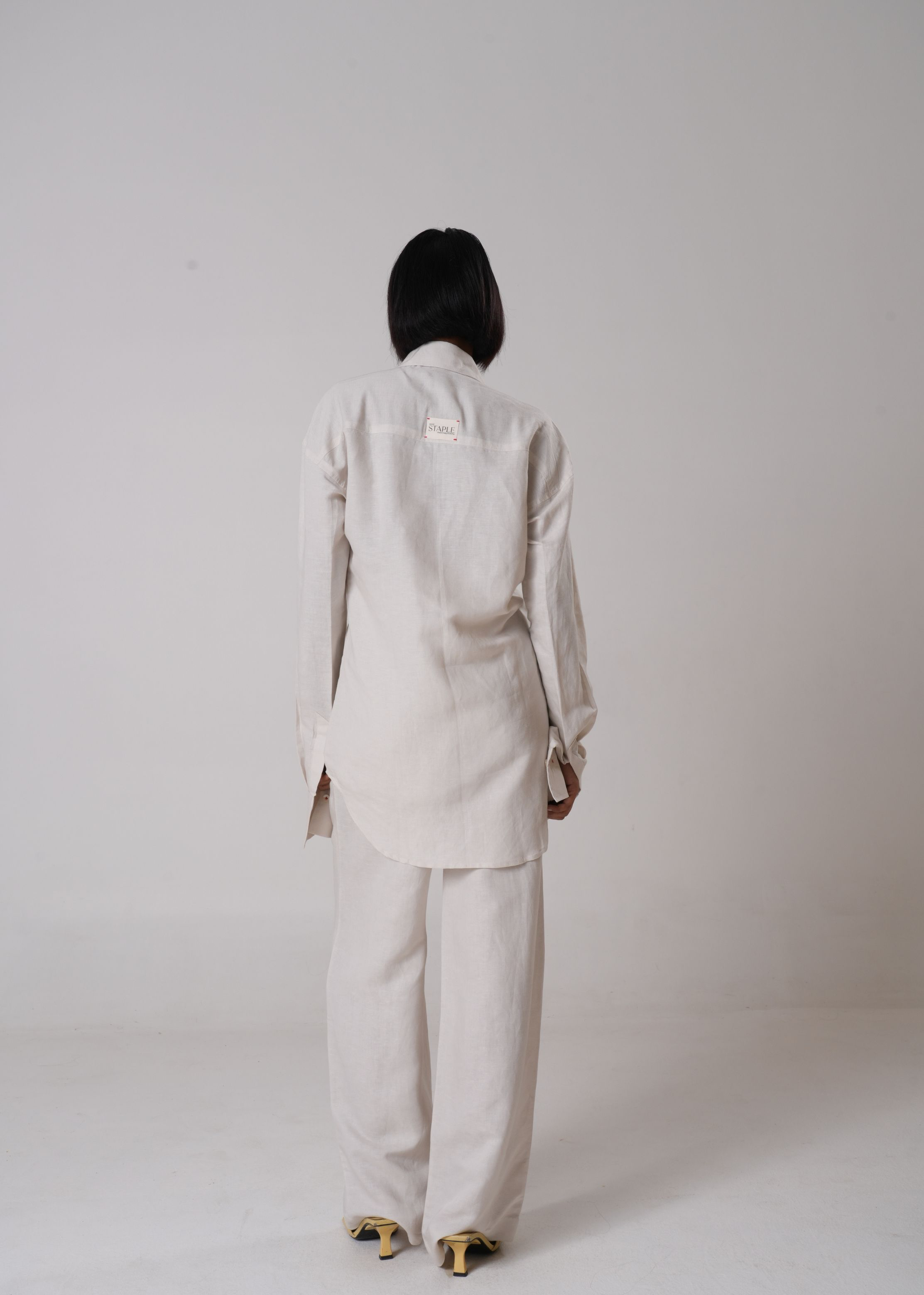 Oversized collared shirt with button fastening in front, Staple label detail towards the end of the placket and pleat detail at the back along with red thread detail around the button. You can size down for this product due to its oversized fitting.