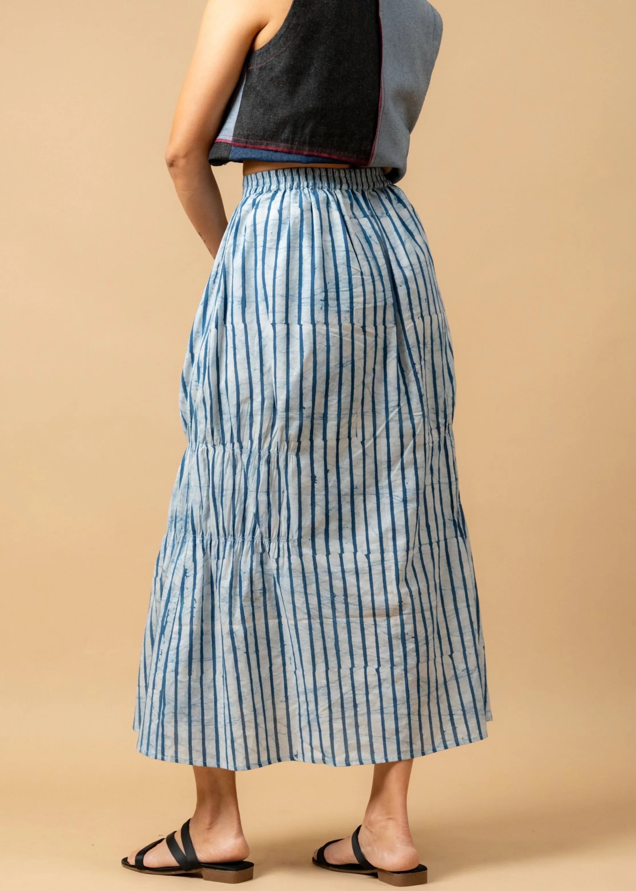 Deconstructed skirt with gathers and back elastic with inseam side pockets. Made from hand painted batik cotton fabric Color: Blue Size & Fit Fit: Regular Note: Each piece may come with an extra embroidery or patch but the overall look and feel of the piece are not changed. These pieces are a part of a limited edition collection, the stock is made till the raw material is available.