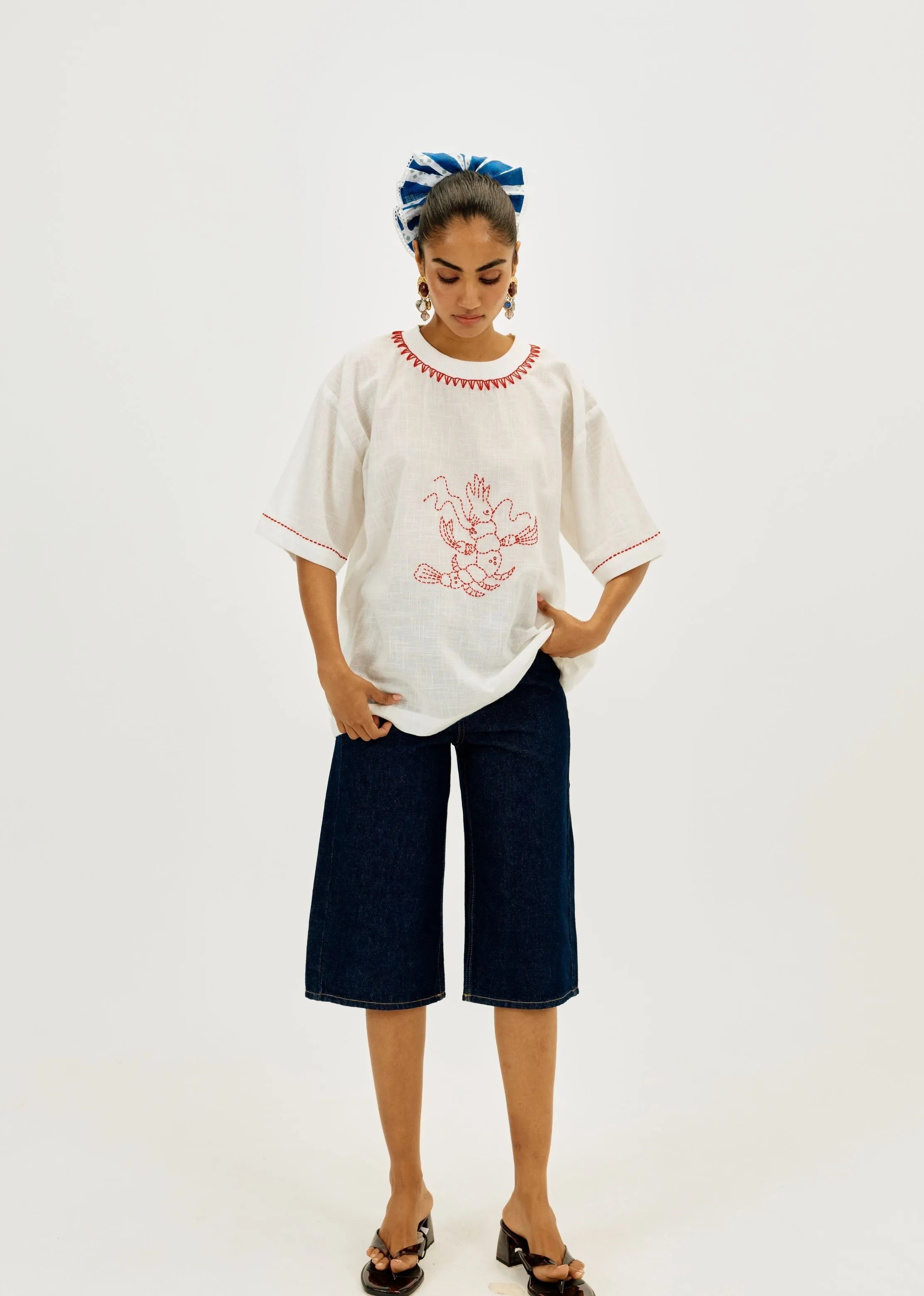 A shirt so nice, you’ll want to wear it twice. This woven top features a ribbed neck and is hand-embroidered with our playful lobster motif in bright red, adding a dash of whimsy. Our product is crafted in Pune, India, using techniques of traditional hand embroidery. Subtle variations in patterns are natural to this process. We believe this makes each creation unique and charming. Some call it je ne sais quoi. We call it JODI. If you wish to have the length of the garment altered, please mention your request in the special instructions section at checkout, with your desired length, customisation charges may apply.