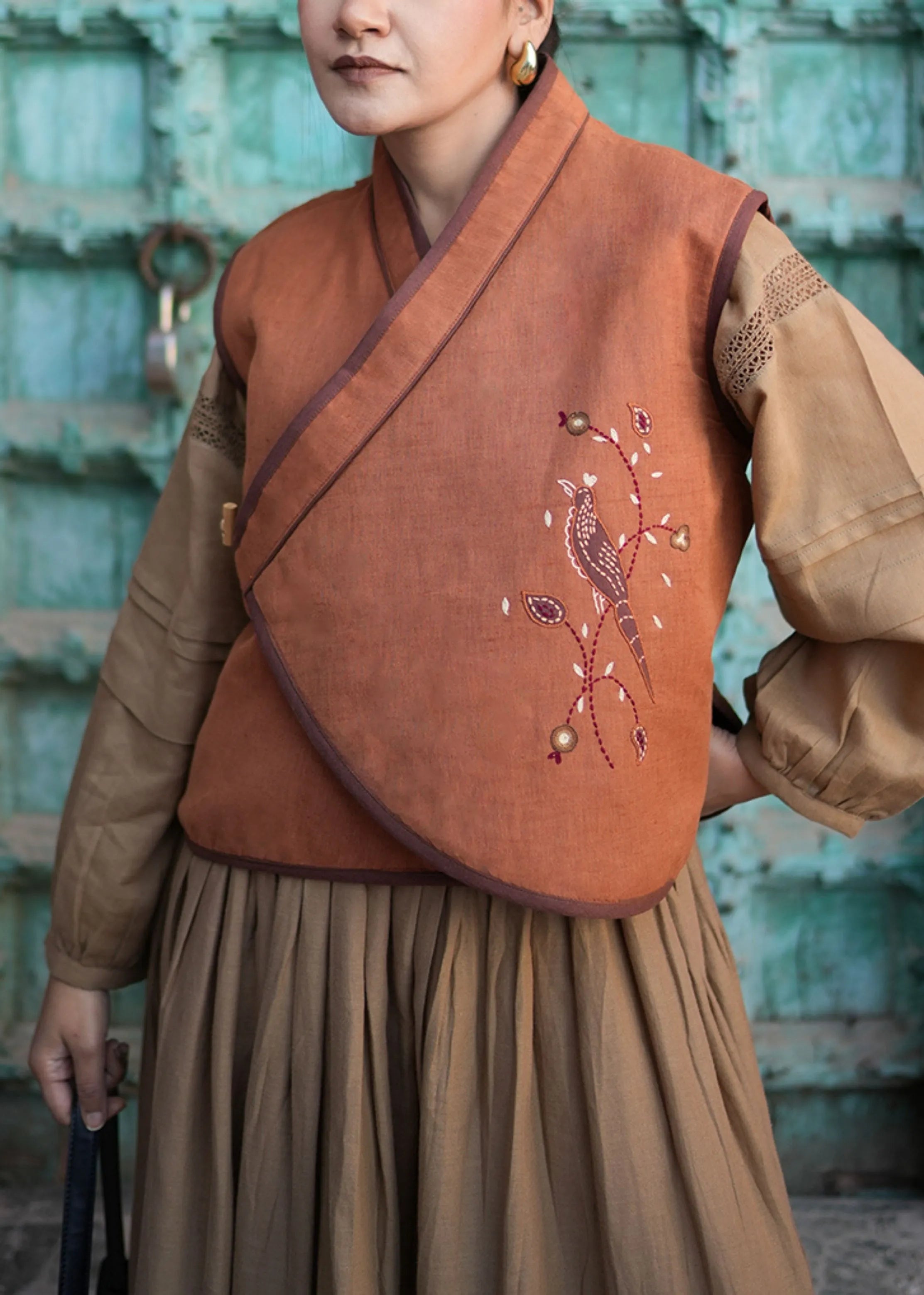 The Loom jacket, featuring a quilted style made in linen fabric, showcases a wrap silhouette and hand-embroidered appliqué work. It is paired with our Isabella skirt and Valentina blouson in a custom mocha color.