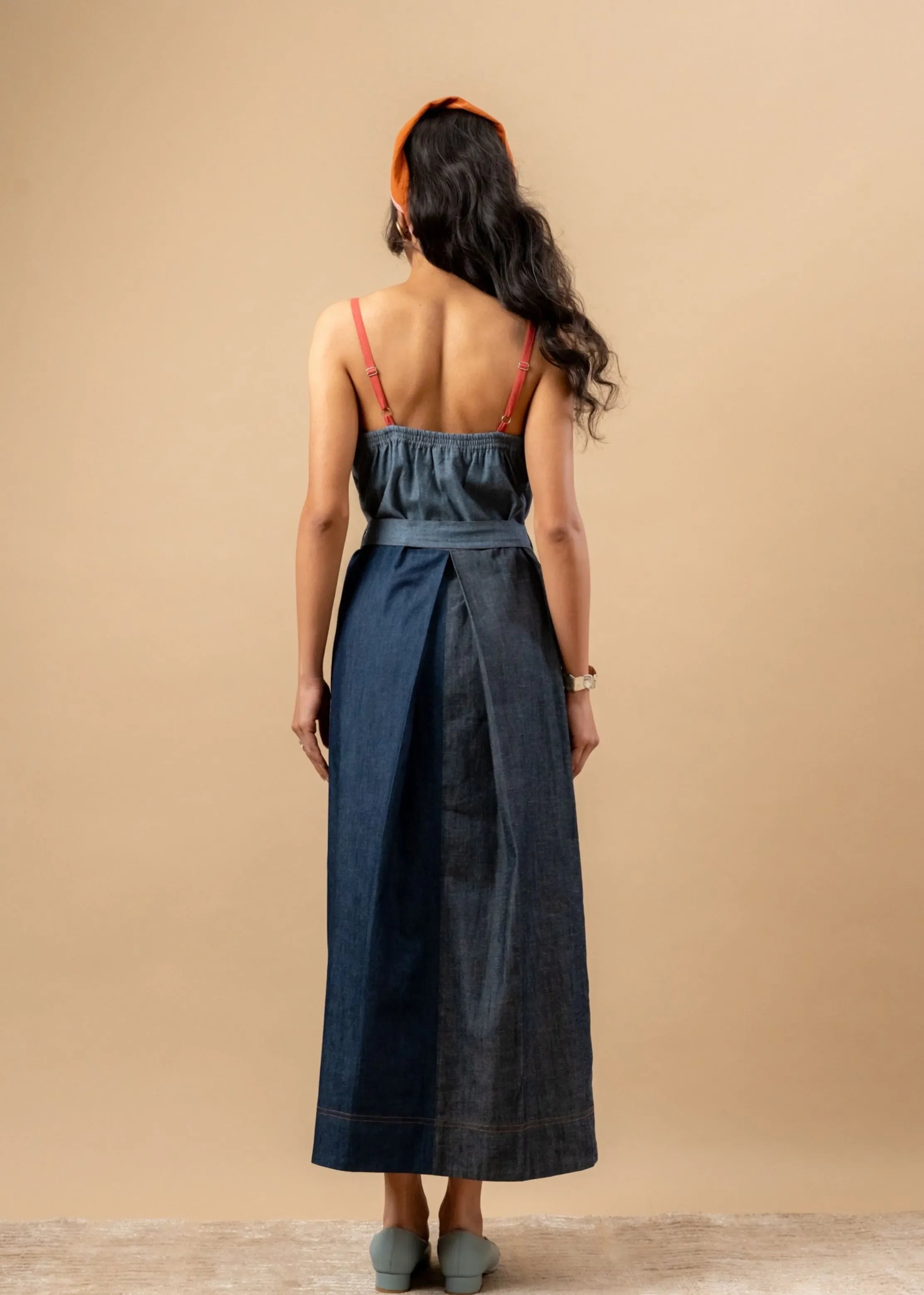 Upcycled denim dress with adjustable contrast straps, big box pleats for flare and side pockets, the dress comes with a fabric belt. Each piece may come with an extra patch or embroidery to save as much fabric as we can. Each piece may look different as this is made from upcycled denim waste.