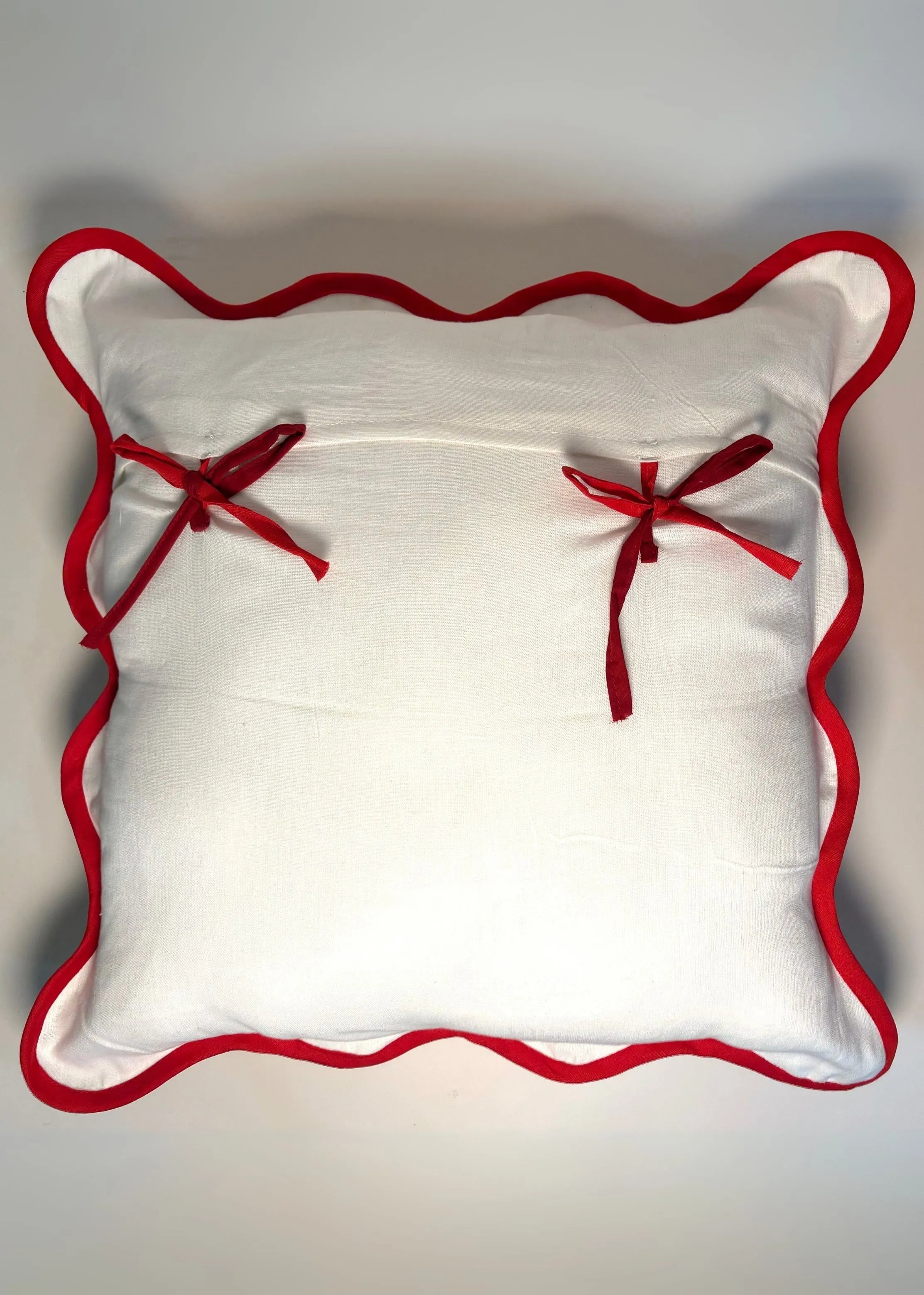 Cotton Hand Block Printed Cushion Cover, features a red heart block printed with a wavy border in red, curating a modern aesthetic with care and precision. This cushion cover adds a touch of contemporary style to any space. Made from premium cotton fabric, it blends durability with softness for comfort and style. Elevate your home decor with timeless artisanal charm. General Care: Handwash with mild soap Assembly: None required. Simply insert a filler, tie the knots and throw on your sofa or bed. Dimension: 18" x 18” •Note: This product doesnot include filler.