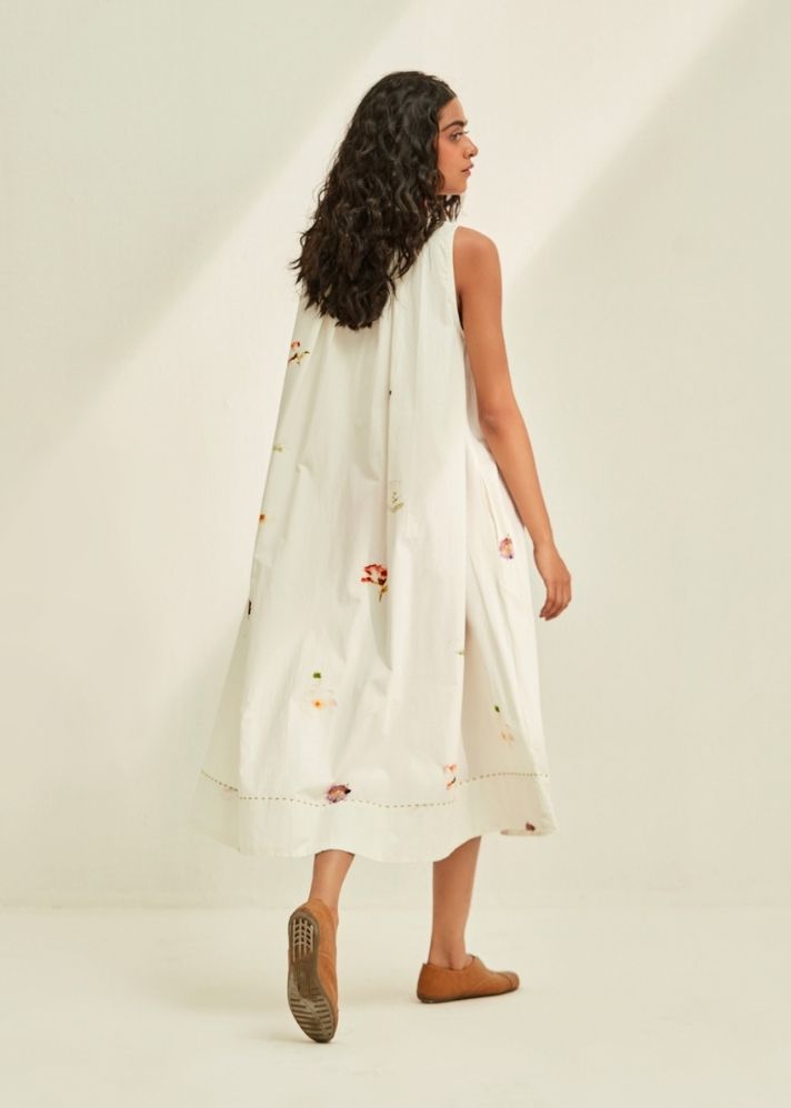 No Return No ExchangeExperience the magic of this season in our airy white floral dress. crafted in poplin. Handcrafted in India. Side seam pockets.