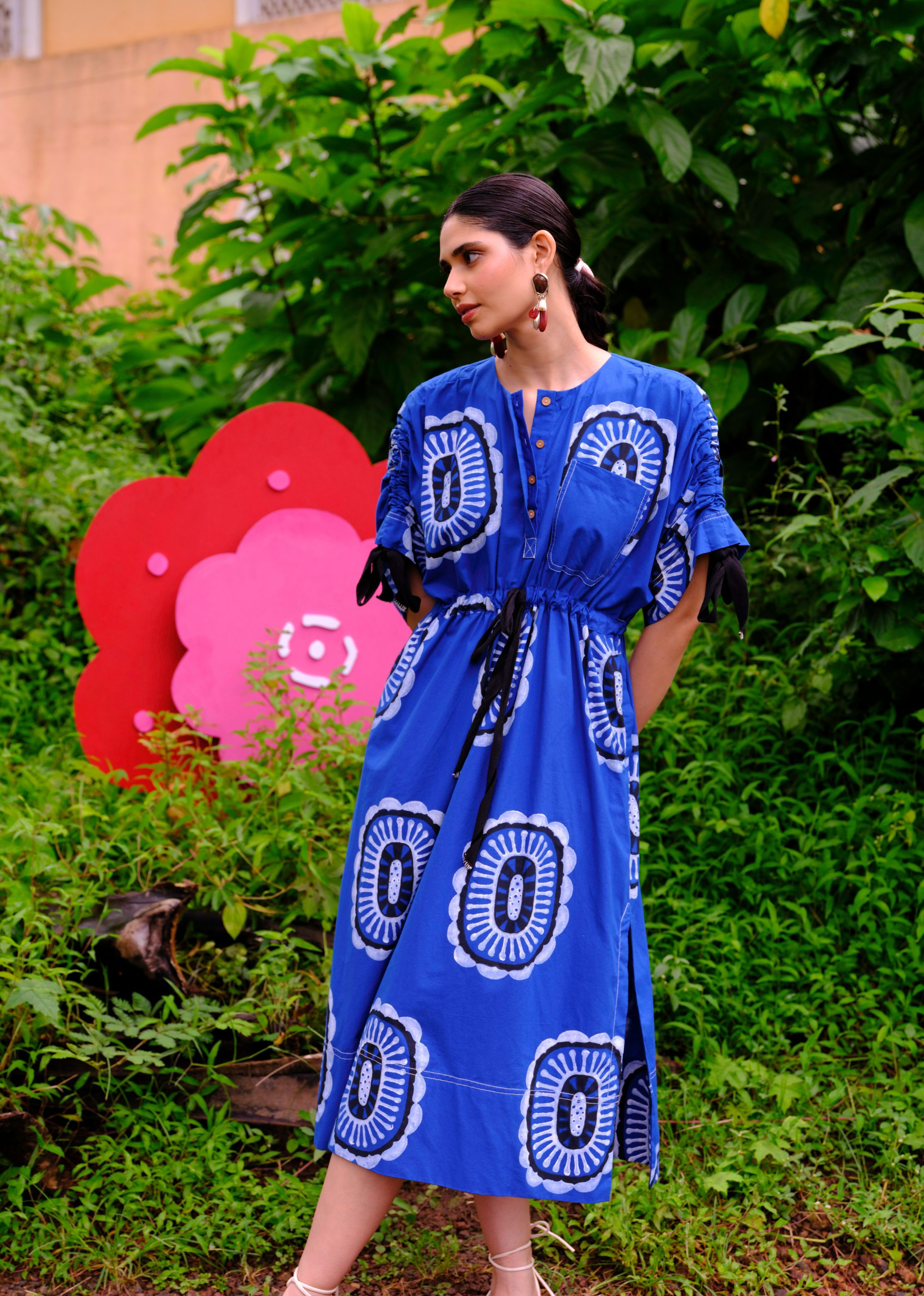 This dress is full of cool details. A tie-up lace at the waist for the perfect adjustable fit, cinched sleeves with tie-ups, side slits for extra flow, and naturally, pockets—because who doesn’t need those? We believe customers have a right to know how their product was made. 4.5 metres of cotton poplin fabric sourced from Jaipur has been used for this piece. Manufactured in our workshop at Pune, India. This product is hand-printed in Jaipur, India using traditional techniques. Subtle variations in patterns are natural to this process. We believe this makes each creation unique and charming. Some call it je ne sais quoi. We call it JODI. If you wish to have the length of the garment altered, please mention your request in the special instructions section at checkout, with your desired length.