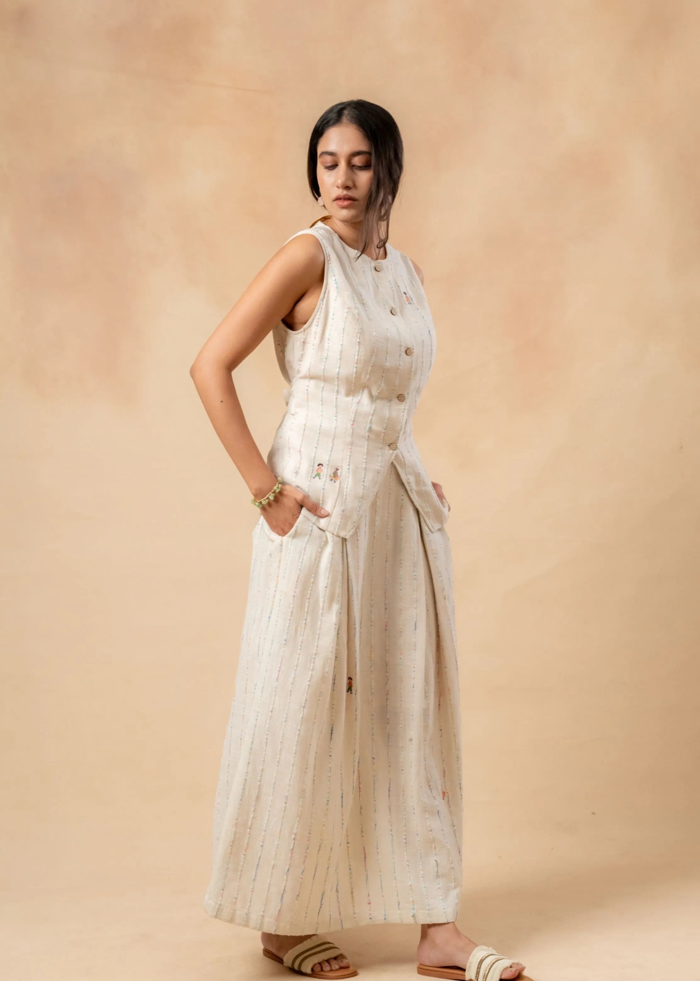 This set includes a textured, fitted waistcoat made from handwoven upcycled fabric, crafted from waste materials. It features an adjustable belt at the back. The outfit is complemented by a beige organic cotton skirt, which has inverted box pleats both at the front and back, a concealed zipper, and randomly placed doodle embroidery. Each piece may come with an extra patch or embroidery to save as much fabric as we can.