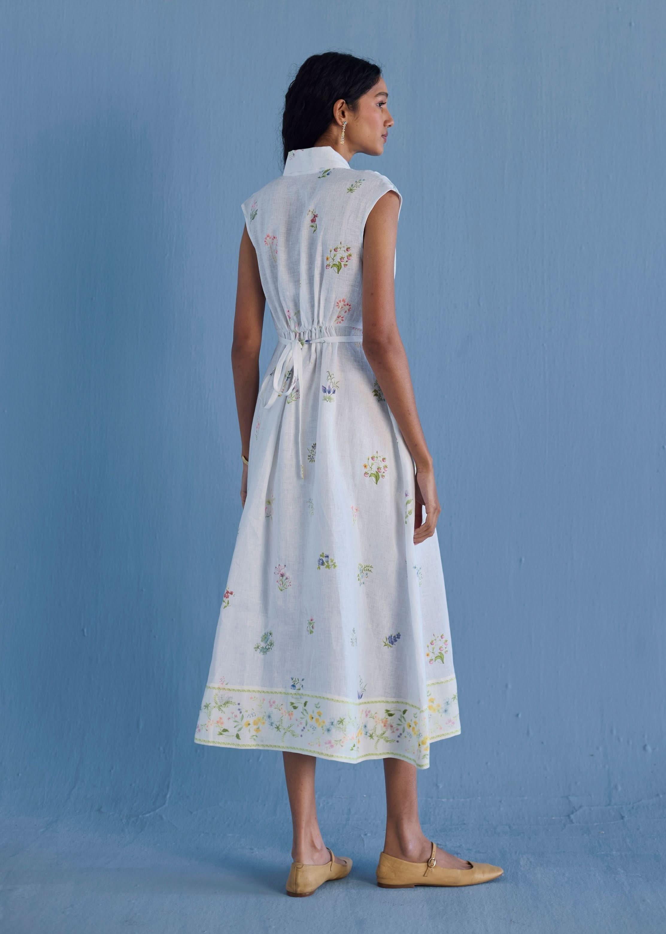 Our favourite contemporary shawl collar midi dress is handcrafted from our signature yarn-dyed linen printed with a hand-painted floral print. Gathered thoughtfully at the waist, the Mema Dress is finished with a printed sheer linen border at hem, pockets and has hand-embroidered bead detailing on the linen fabric belt. We love the Mema dress for it's versatility and it is one of our favourites to dress down or up.