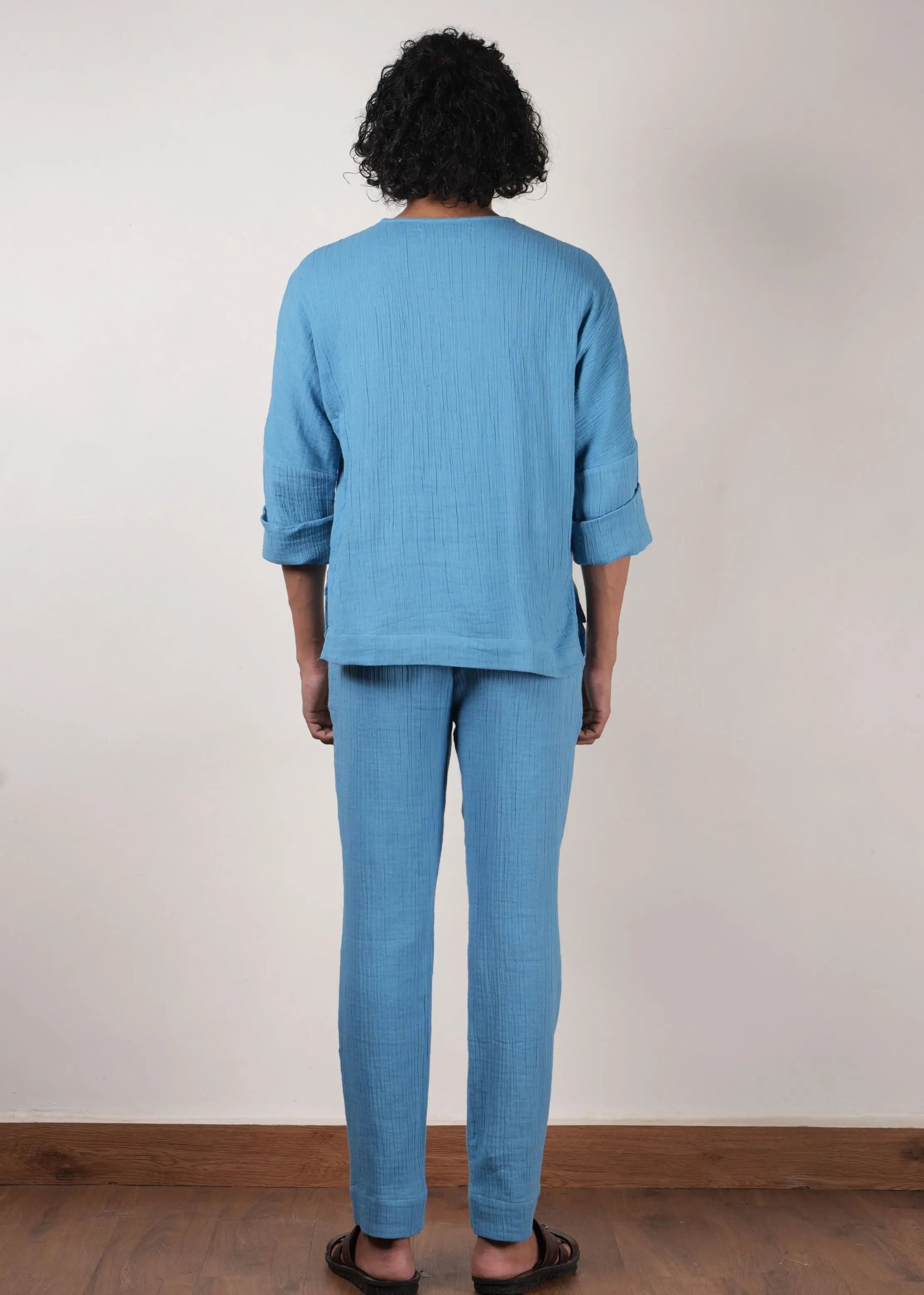 A comfort fit t-shirt with side shoulder zipper opening and extended sleeves comes with crush cotton pants both made in 100% natural cotton. Total 2 pcs.