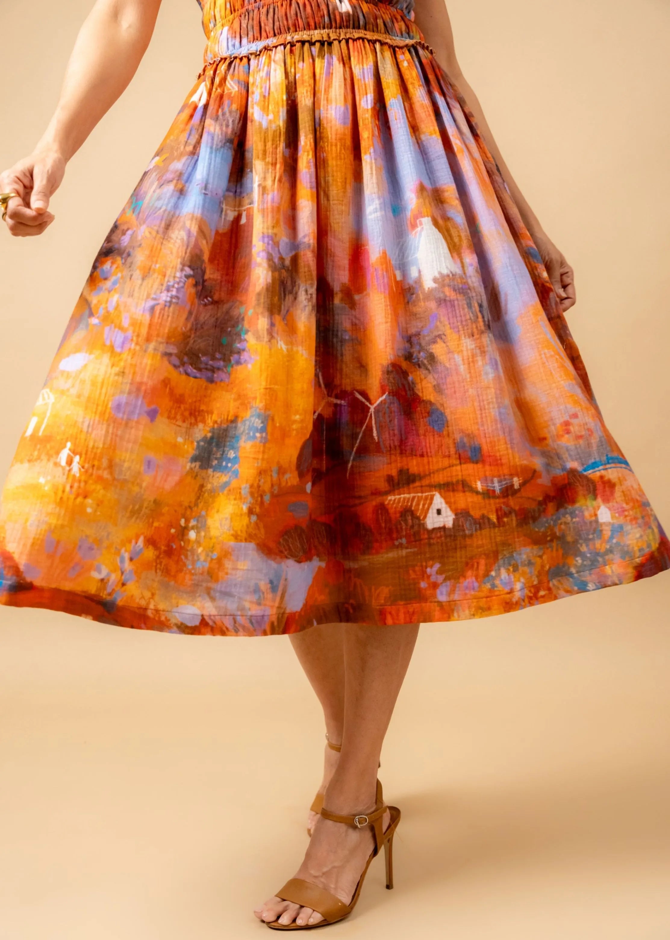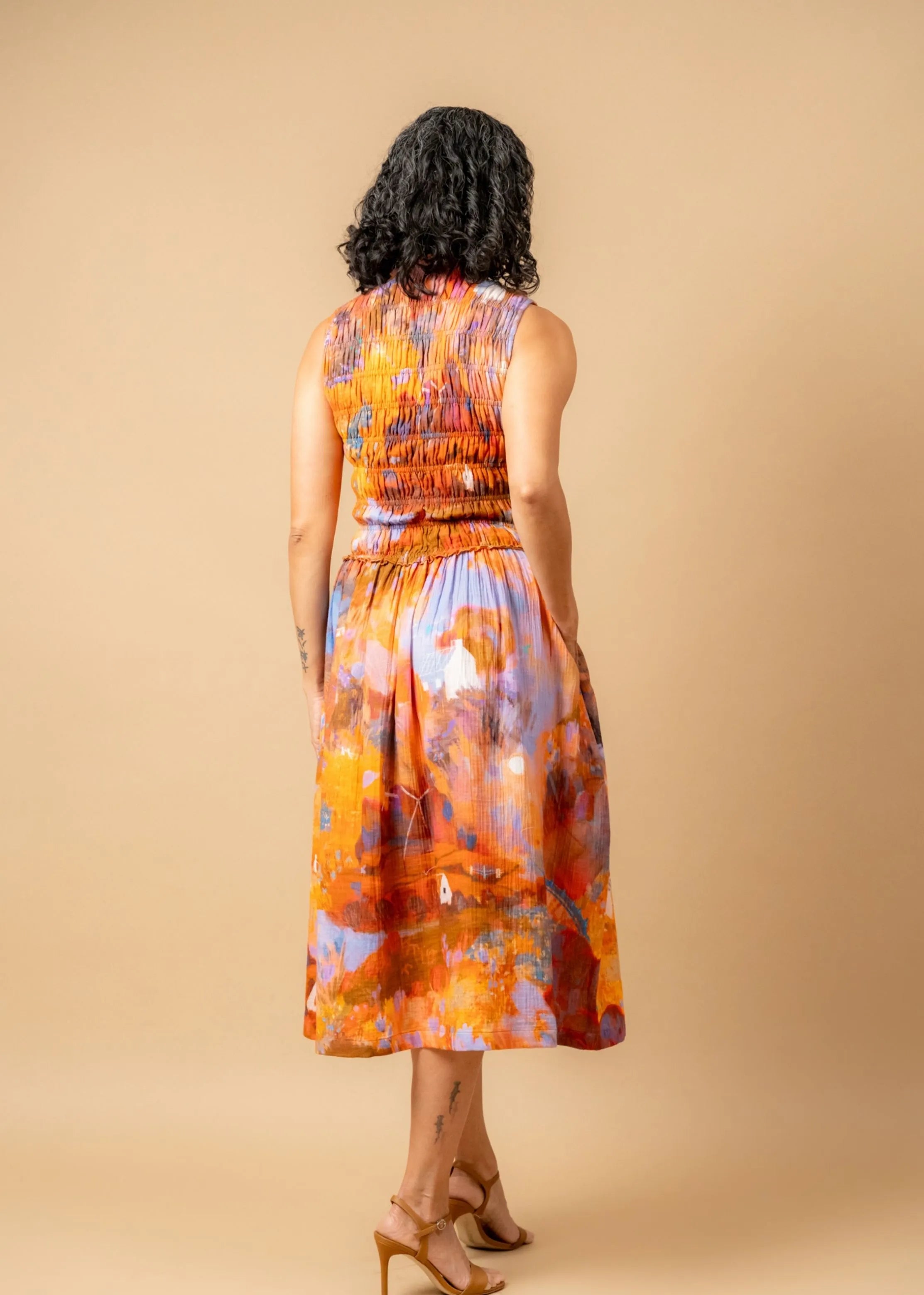 Midi length dress, with smocked top, side pockets made in printed organic cotton gauge. Notes: Each piece may come with an extra embroidery or patch but the overall look and feel of the piece are not changed. These pieces are a part of a limited edition collection, the stock is made till the raw material is available.