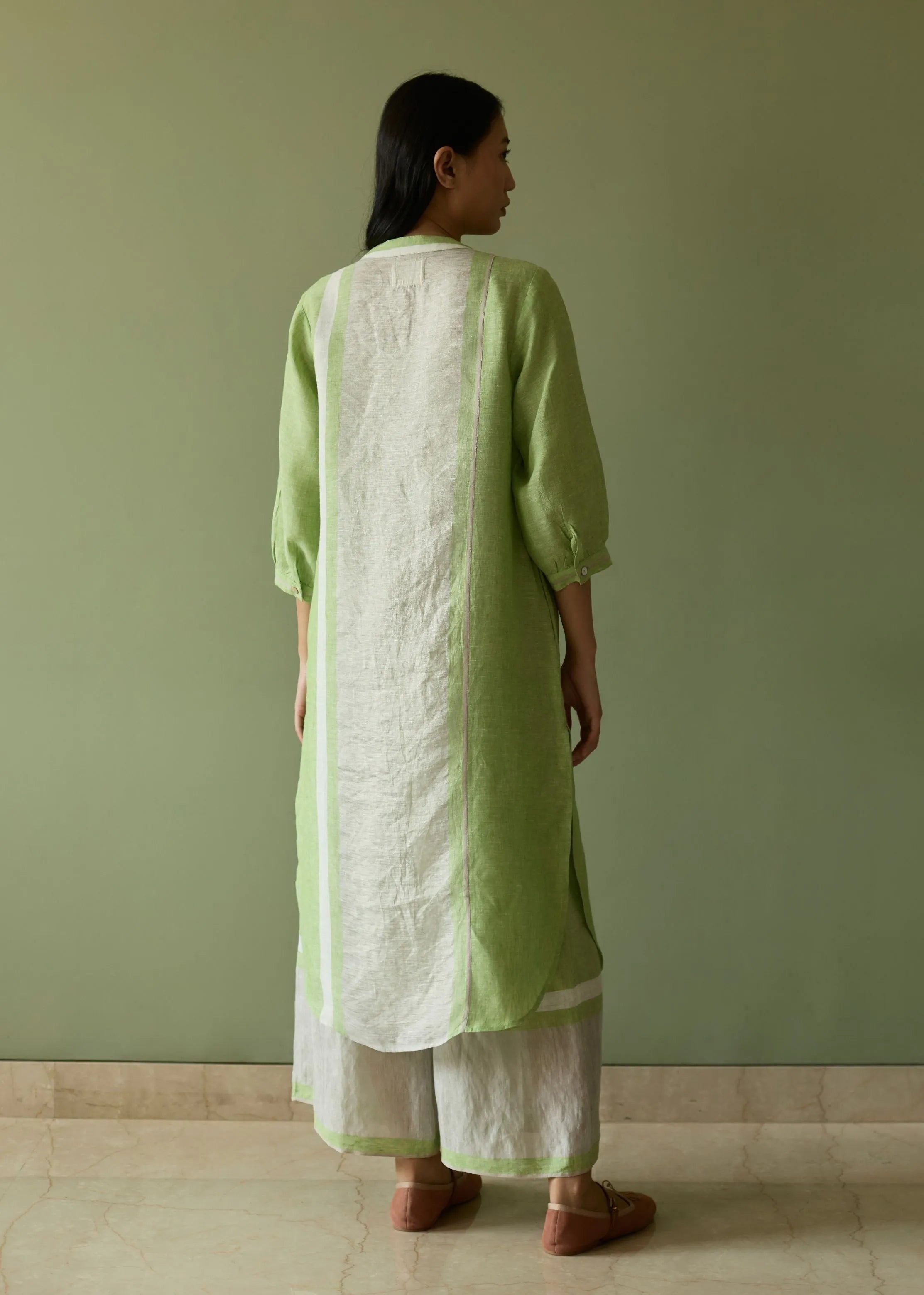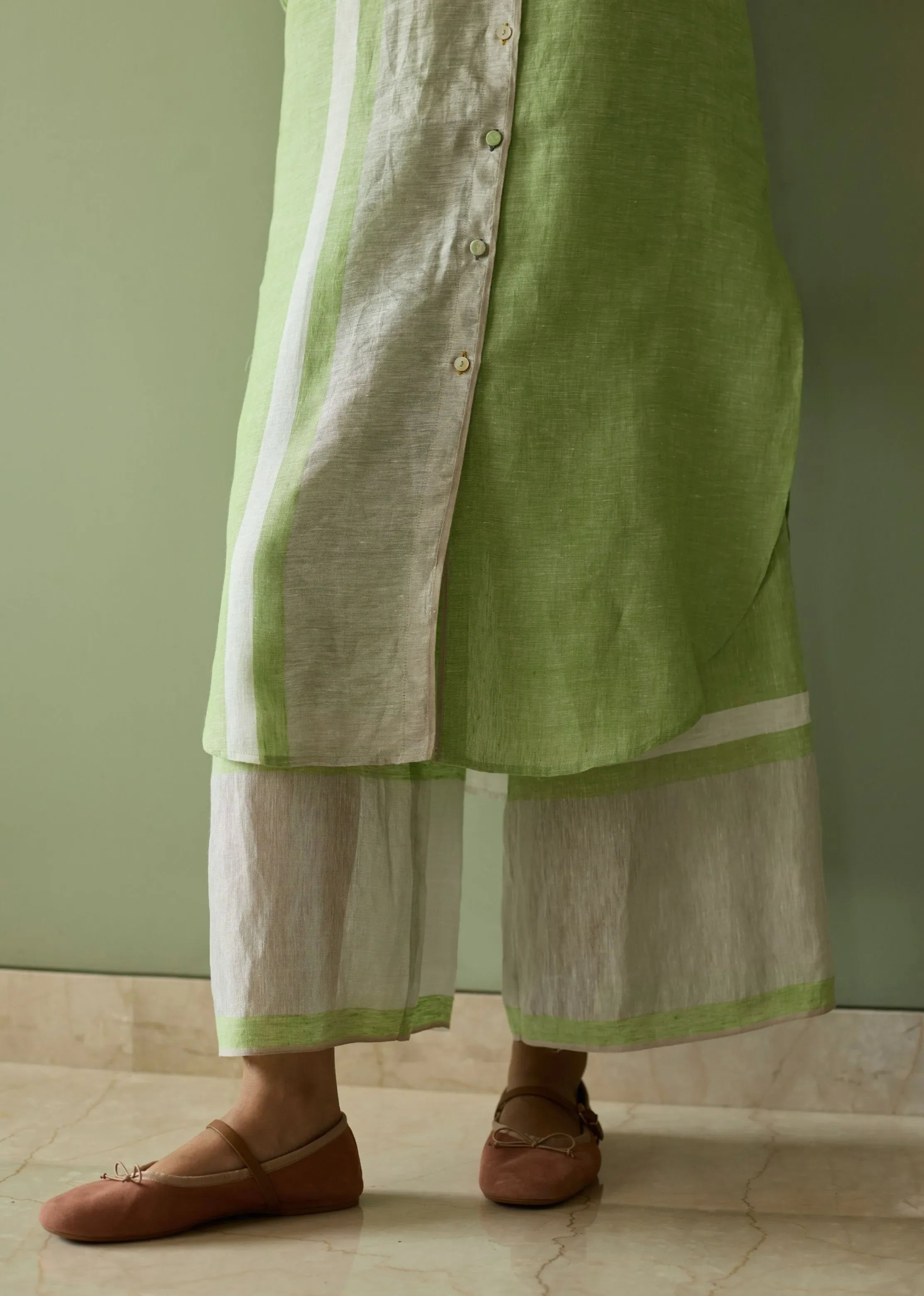 Kurta - A V-neck shirt kurta is crafted from our signature soft handwoven metallic border linen, A subtle grey woven selvedge traces the silhouette along the placket, back and 3/4th sleeve hems. The Mori has comfortable pockets and is finished with a blend of of linen fabric and mother-of-pearl buttons. Pant - Timeless linen culottes with pleats at the waistband, comfortable pockets and a soft elasticated back waistband in our signature soft handwoven metallic linen.