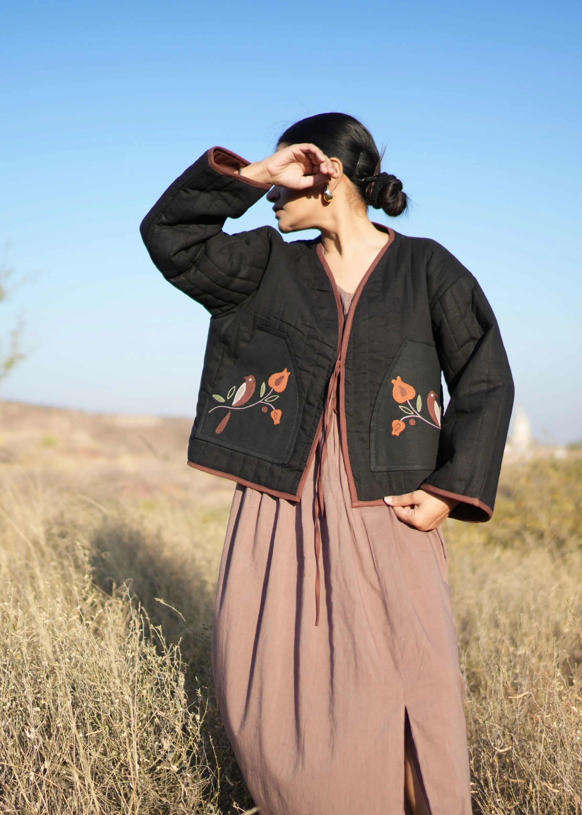 Muse appliqué hand-embroidered quilted jacket. It features beautiful appliqué work on both sides and a front tie-up detail