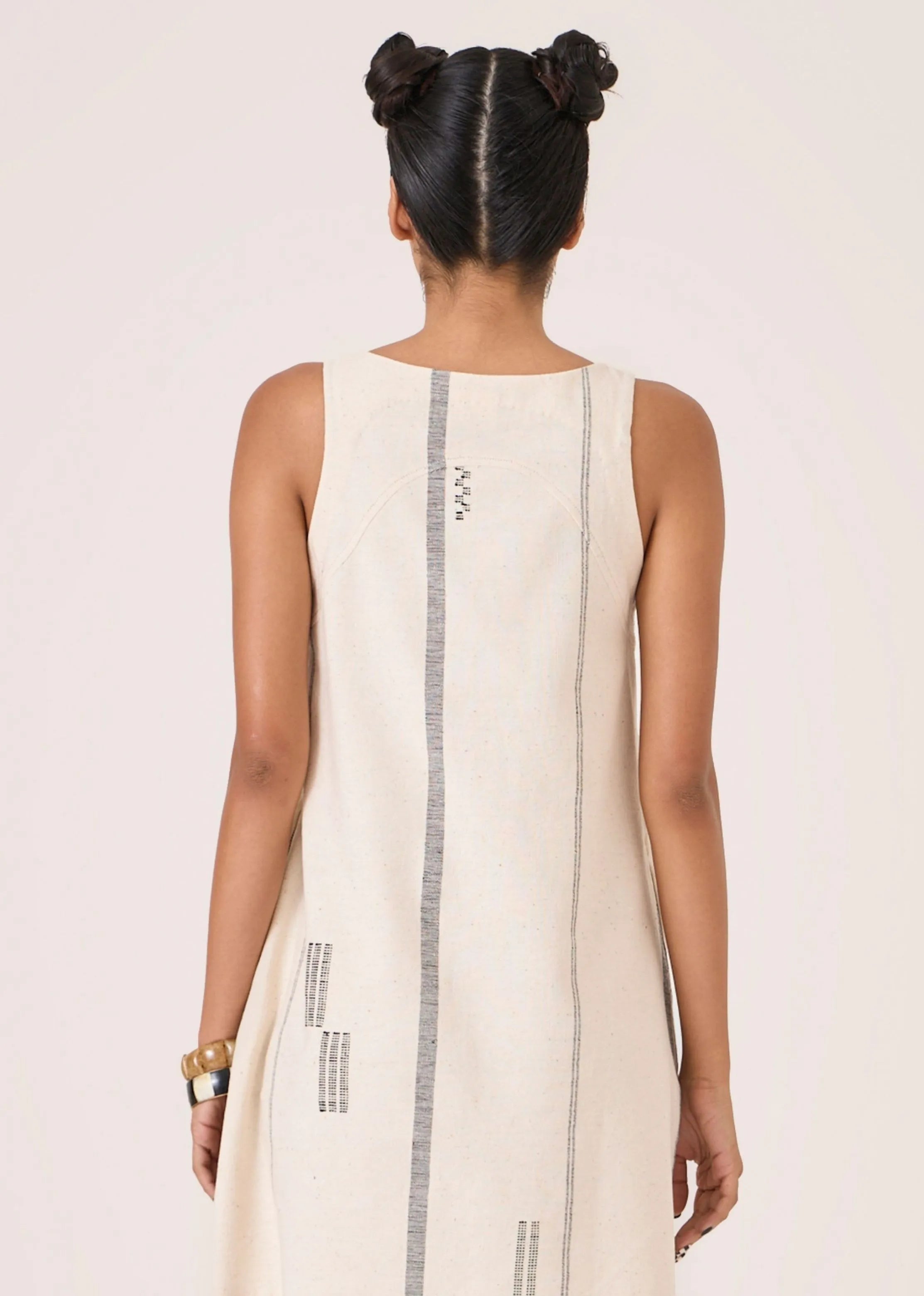 - Sleeveless shift dress - Classic shape - Interesting panel detail - In-seam pockets This signature weave has been developed in our studio and handwoven by artisans in Kutch. Slight irregularities are inherent and speak to the hand processes involved.