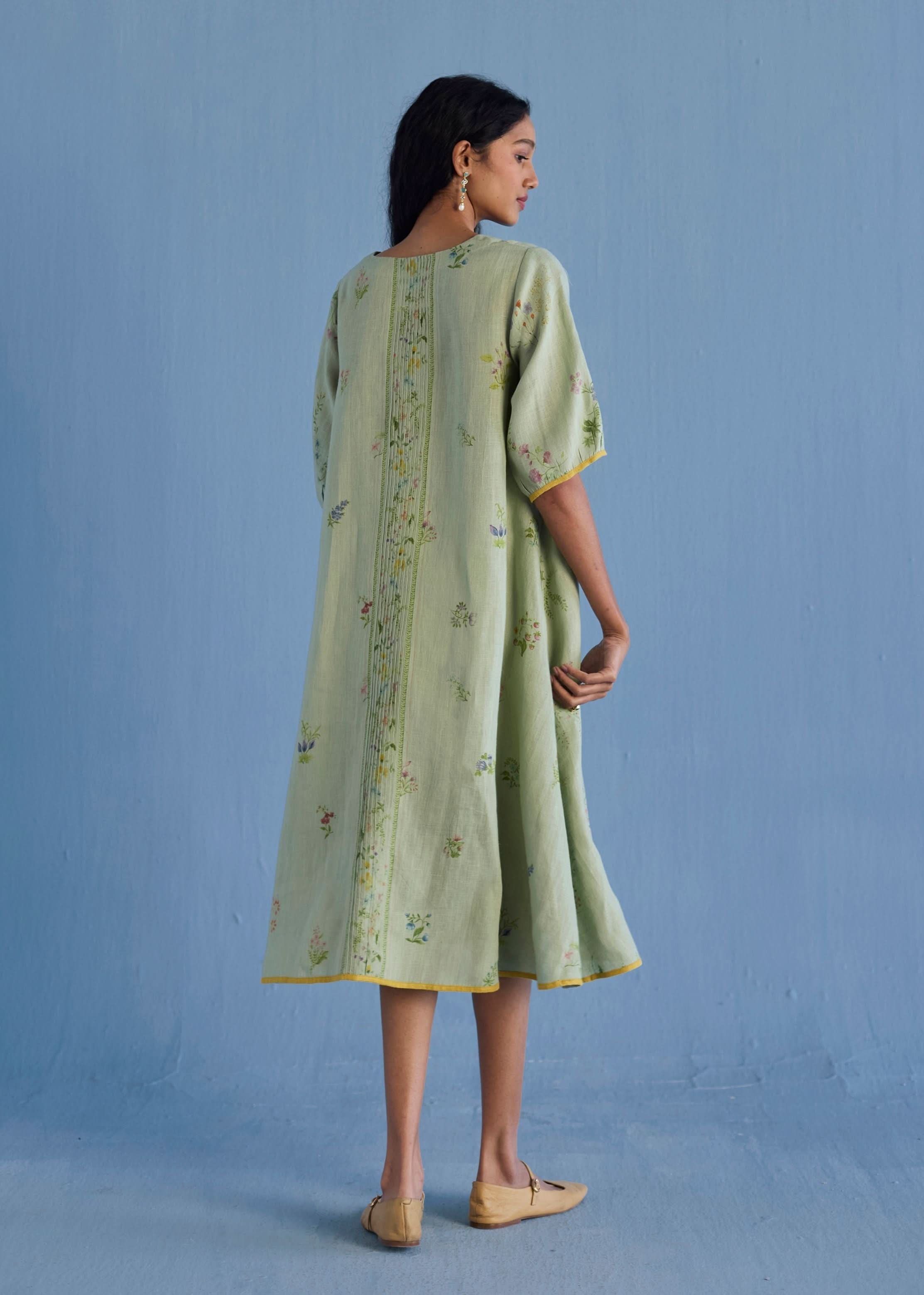An A-line floral printed dress handcrafted in our signature yarn-dyed linen in two hand-painted prints - a jaal floral print and a buta (motif) floral print. The Nami is designed with comfortable pockets, a printed floral border vertically placed at the back with intricate pintucks, and a pop coloured edge detail at the sleeve and bottom hem.