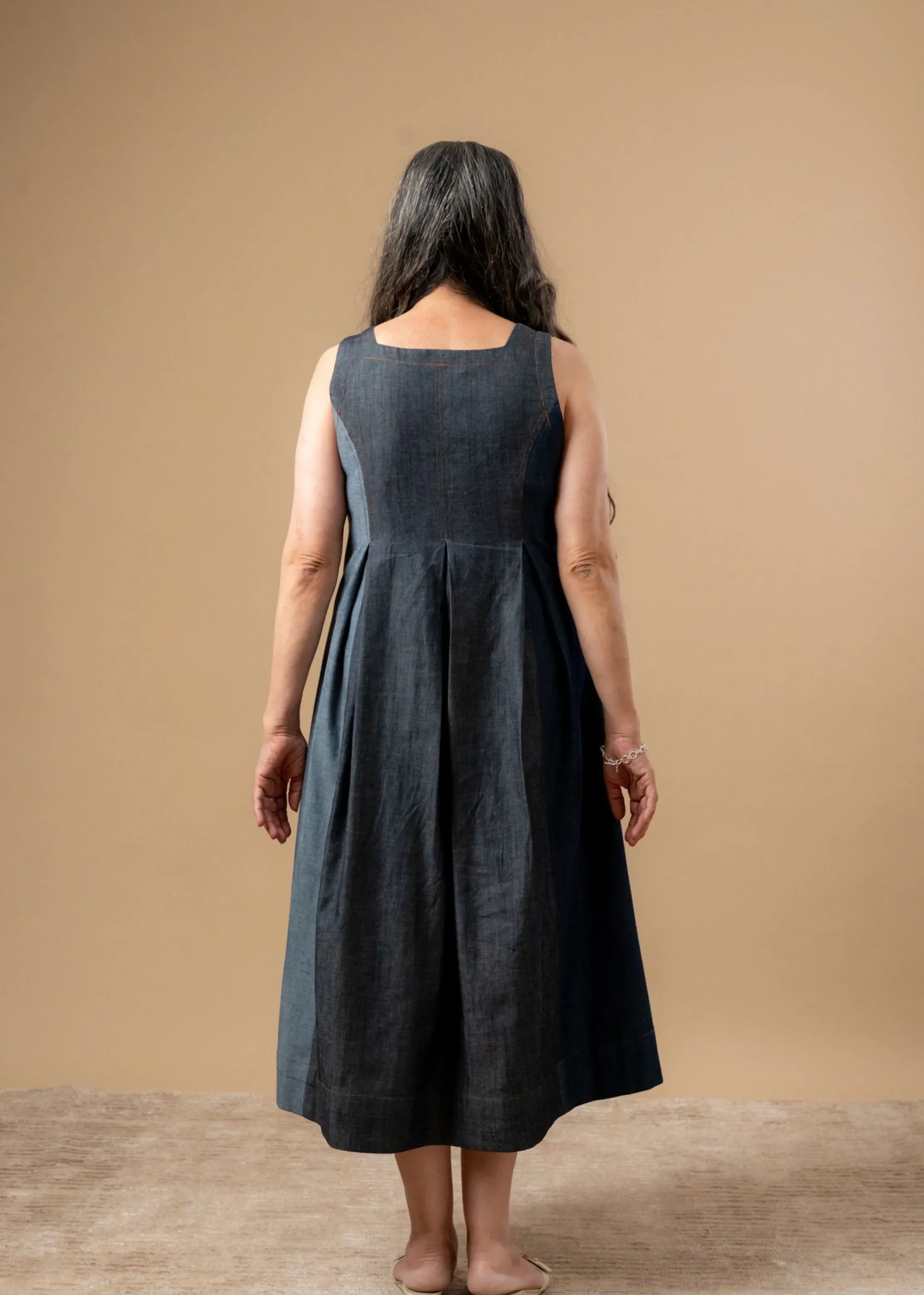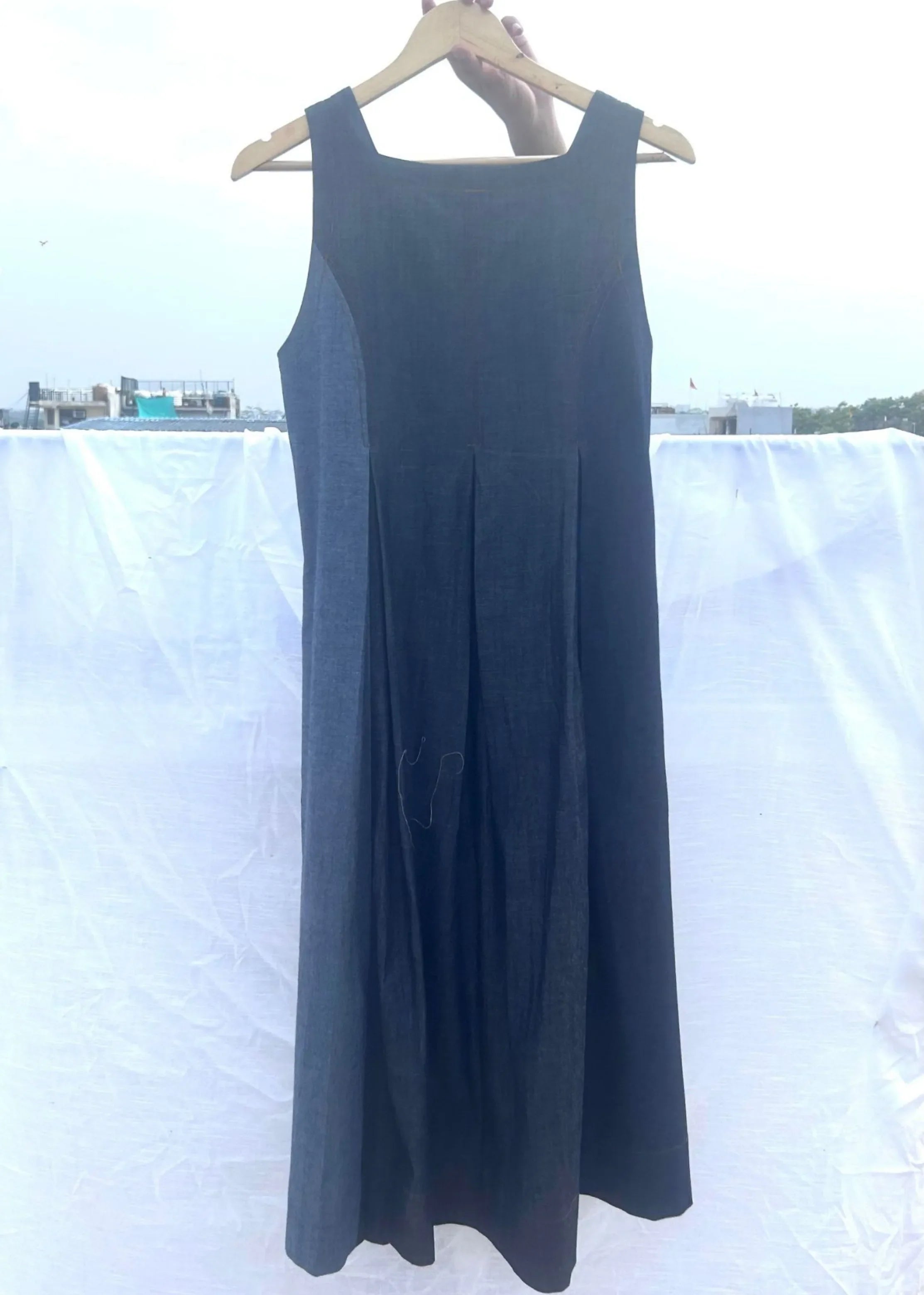 Box pleated A-line dress with pockets made in denim waste Each piece may come with an extra patch or embroidery to save as much fabric as we can. Each piece may look different as this is made from upcycled denim waste.