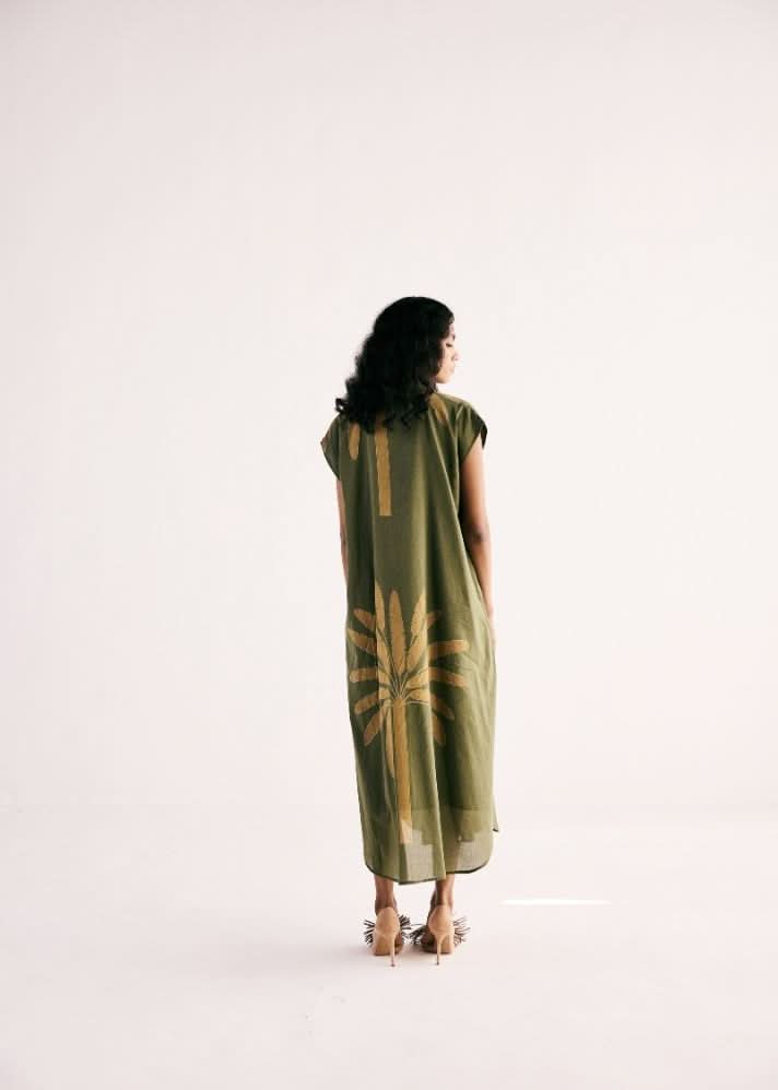 No Return No ExchangeAn olive green long shirt dress, crafted from soft and breathable cotton mul fabric. it exudes timeless charm. featuring a statement palm leaf print. - Handcrafted in India. - Side seam pockets - Fully lined.