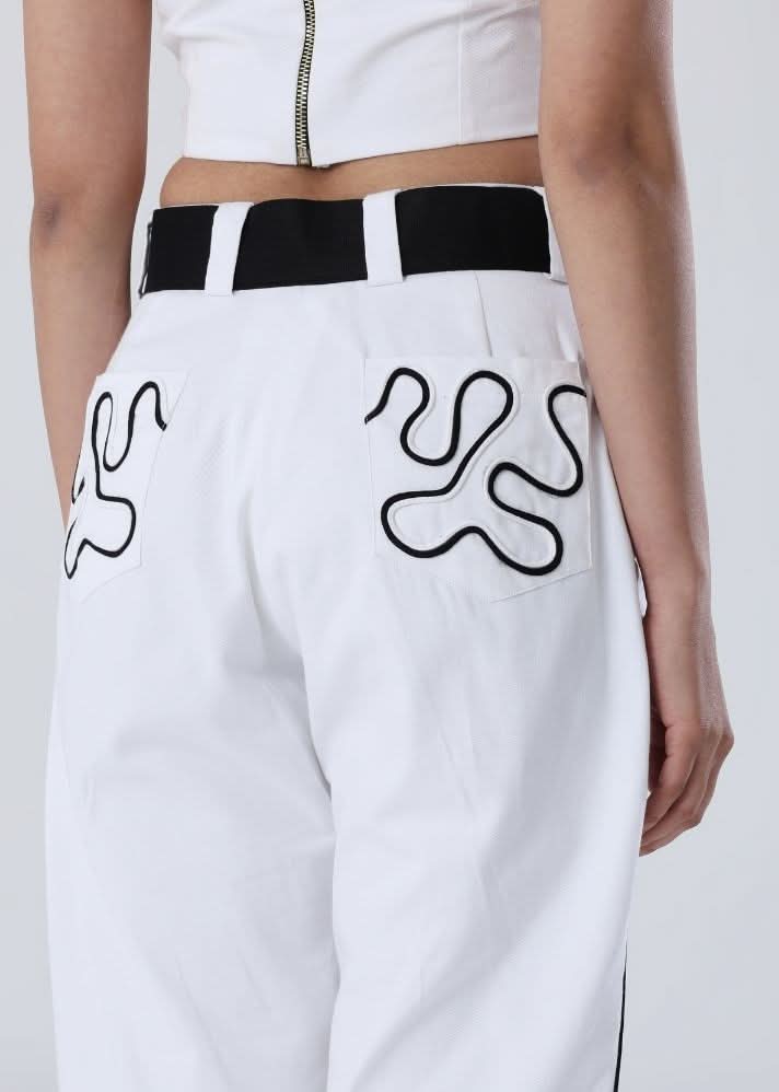 Elevate your style with these white pants, featuring intricate hand-embroidered black/white dori work at the hem. Crafted from premium sustainable fabric, they offer a tailored yet relaxed fit, perfect for any occasion. Pair them with the matching blazer for a statement look or your favorite top for effortless elegance.