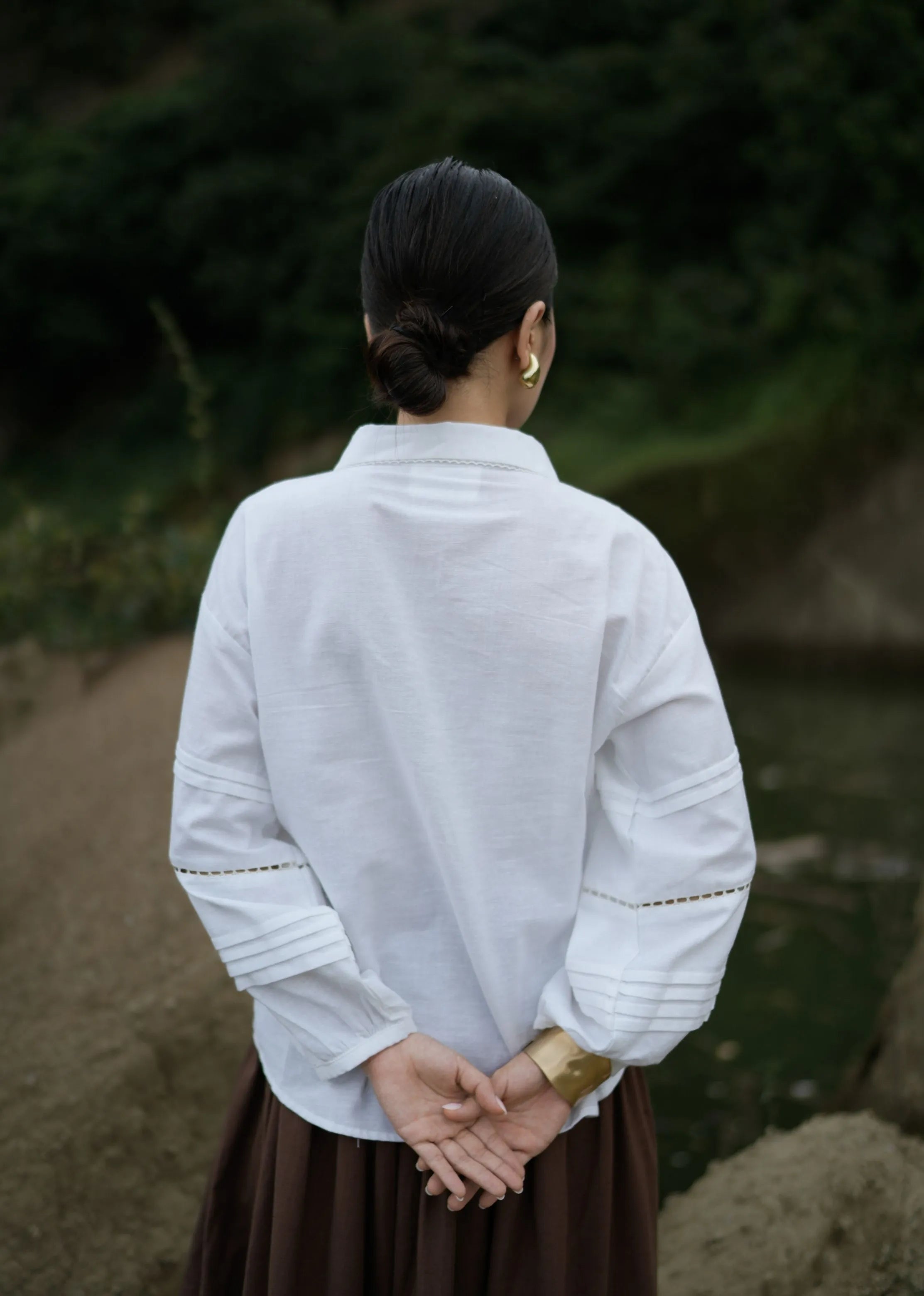 In crisp white cotton-linen, this top features a charming Peter Pan collar trimmed with lace and delicate hand embroidery at the front. Pleated lace detailing on the sleeves adds a vintage touch. Pair it effortlessly with a neutral or striking skirt for a timeless look.