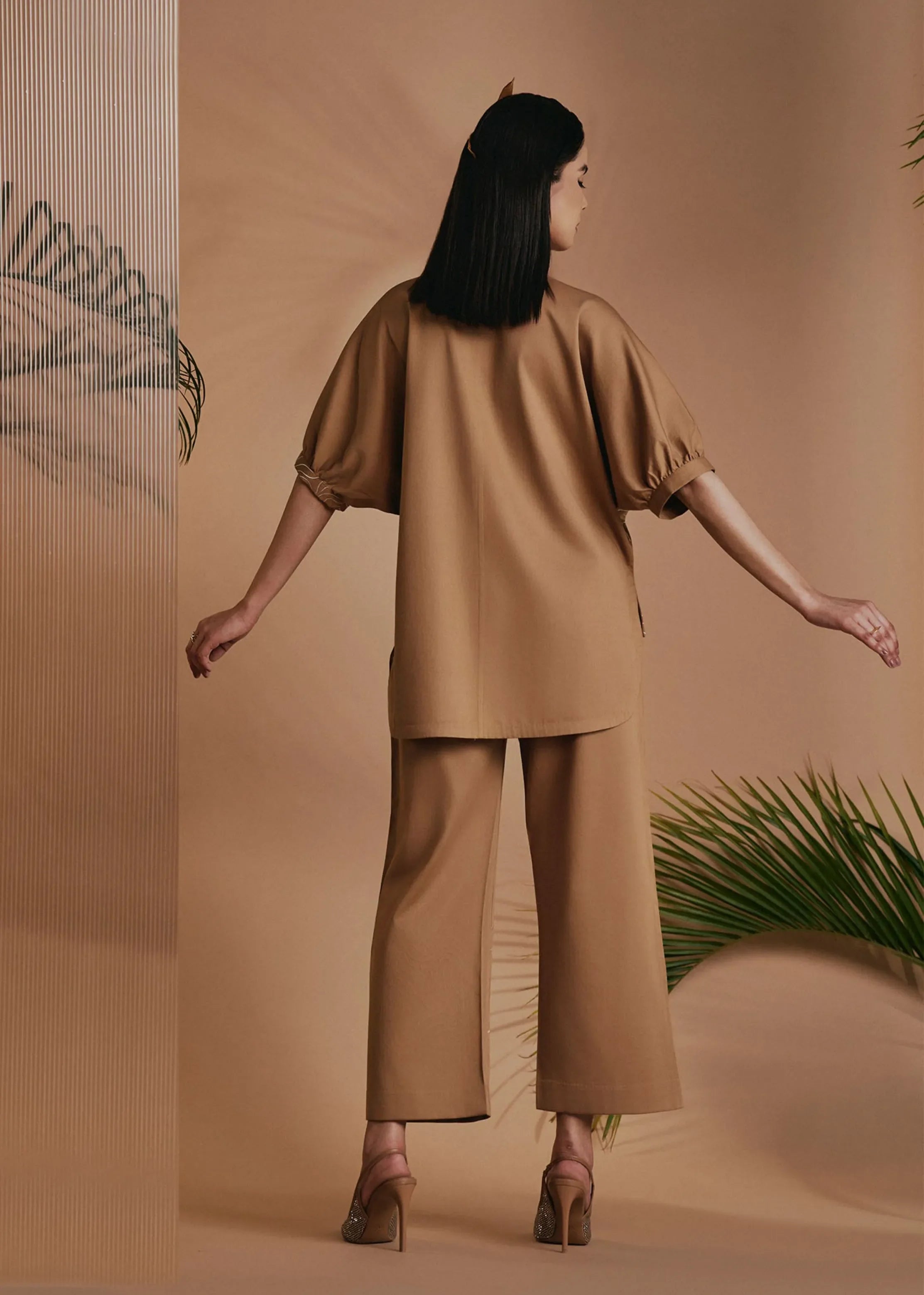 Designed for effortless elegance, this loose-fit kimono style co- ord set features a flat mandarin collar, a concealed button placket, and intricate embroidery. High-low hemline with a side slit. Paired with full-length straight pants, detailed with embroidery, this set is a statement in relaxed sophistication.
