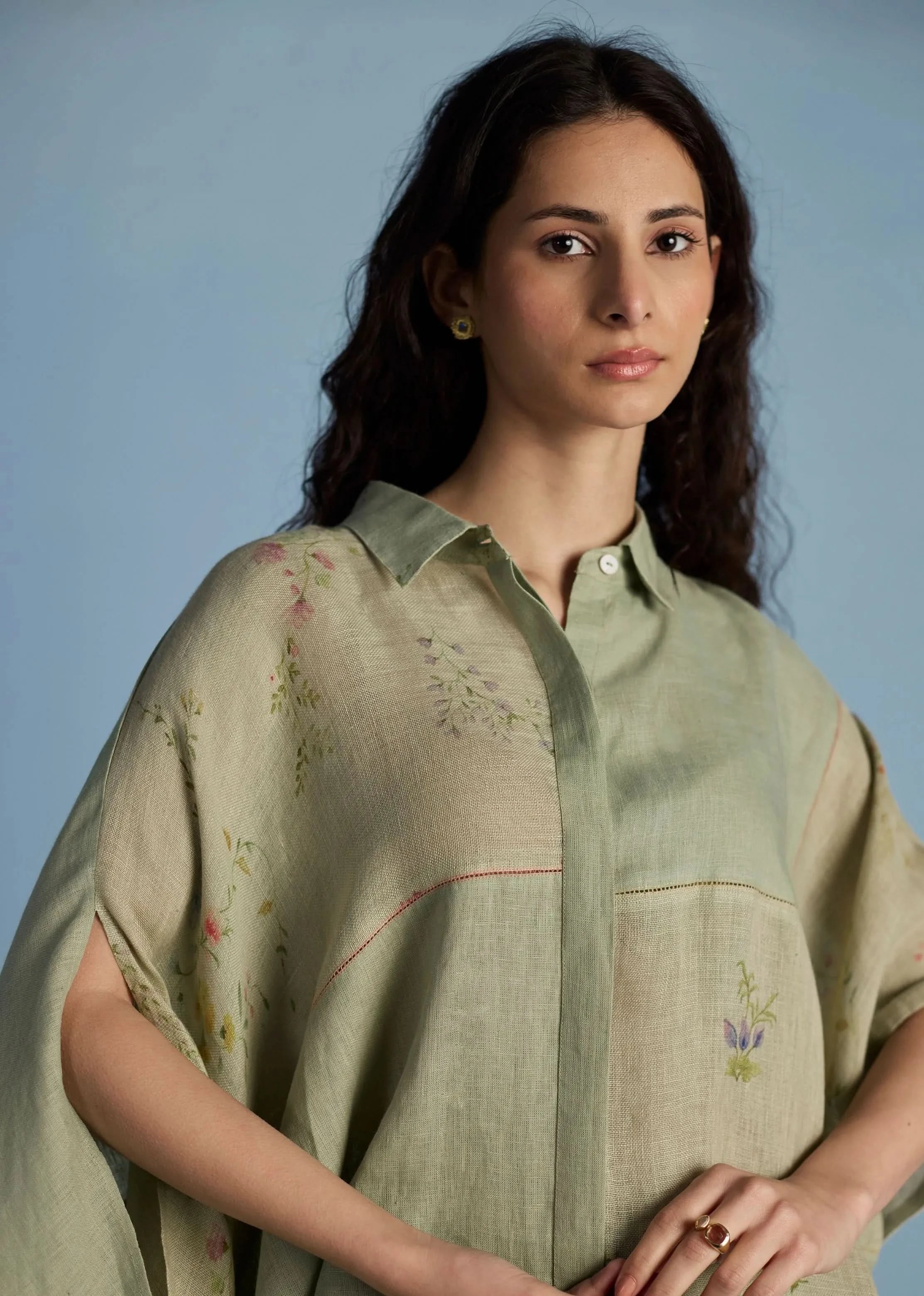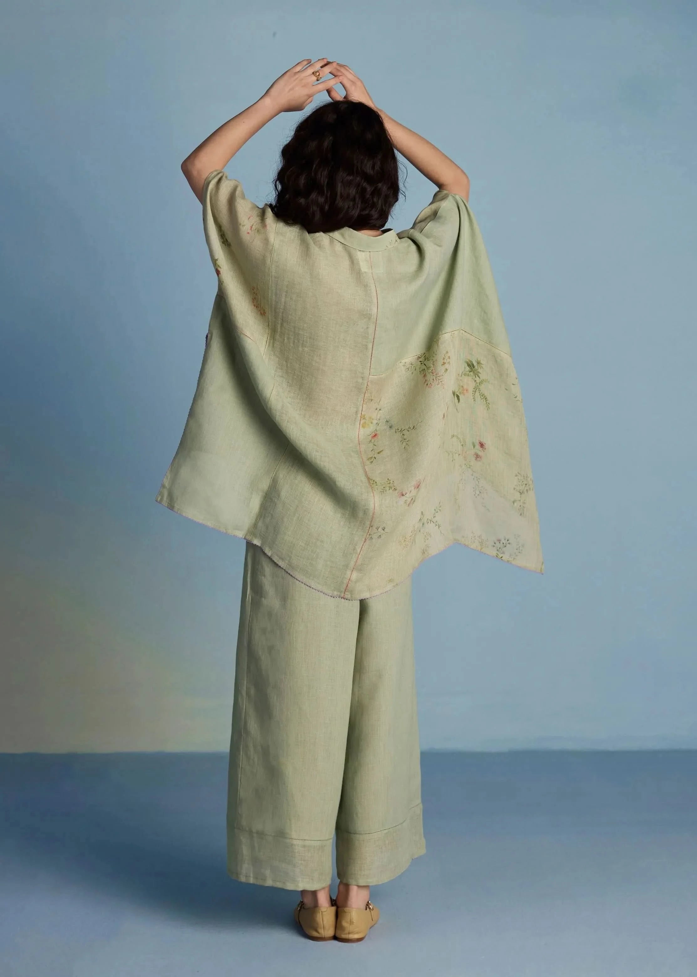 Top -A contemporary take on a kaftan shirt crafted by patching soft yarn-dyed linen and printed sheer linen; featuring hand-illustrated delicate floral prints on the sheer panels and joined with vibrant, multi-colored intricate fagotting thread details. The statement oversized shirt pairs beautifully and easily with our linen pants. It is finished with pop-coloured intricate picoting detail at the hem. Pant- Timeless linen culottes with pleats at the waistband, comfortable pockets and an soft elasticated back waistband in our signature yarn-dyed linen with a sheer linen patchwork band at the hemline with a tonal faggoting stitch detail. The Mapa pairs beautifully with everything.