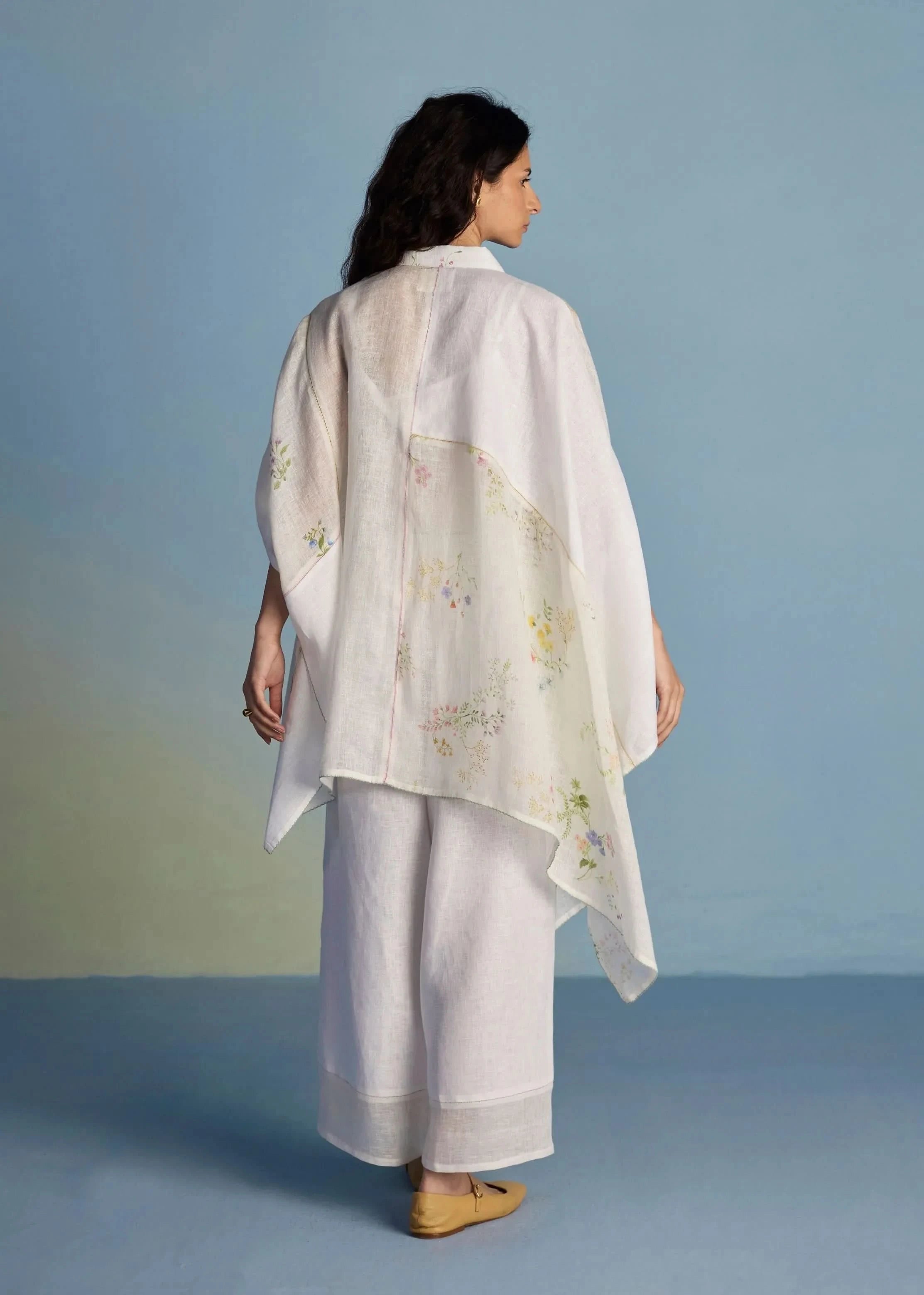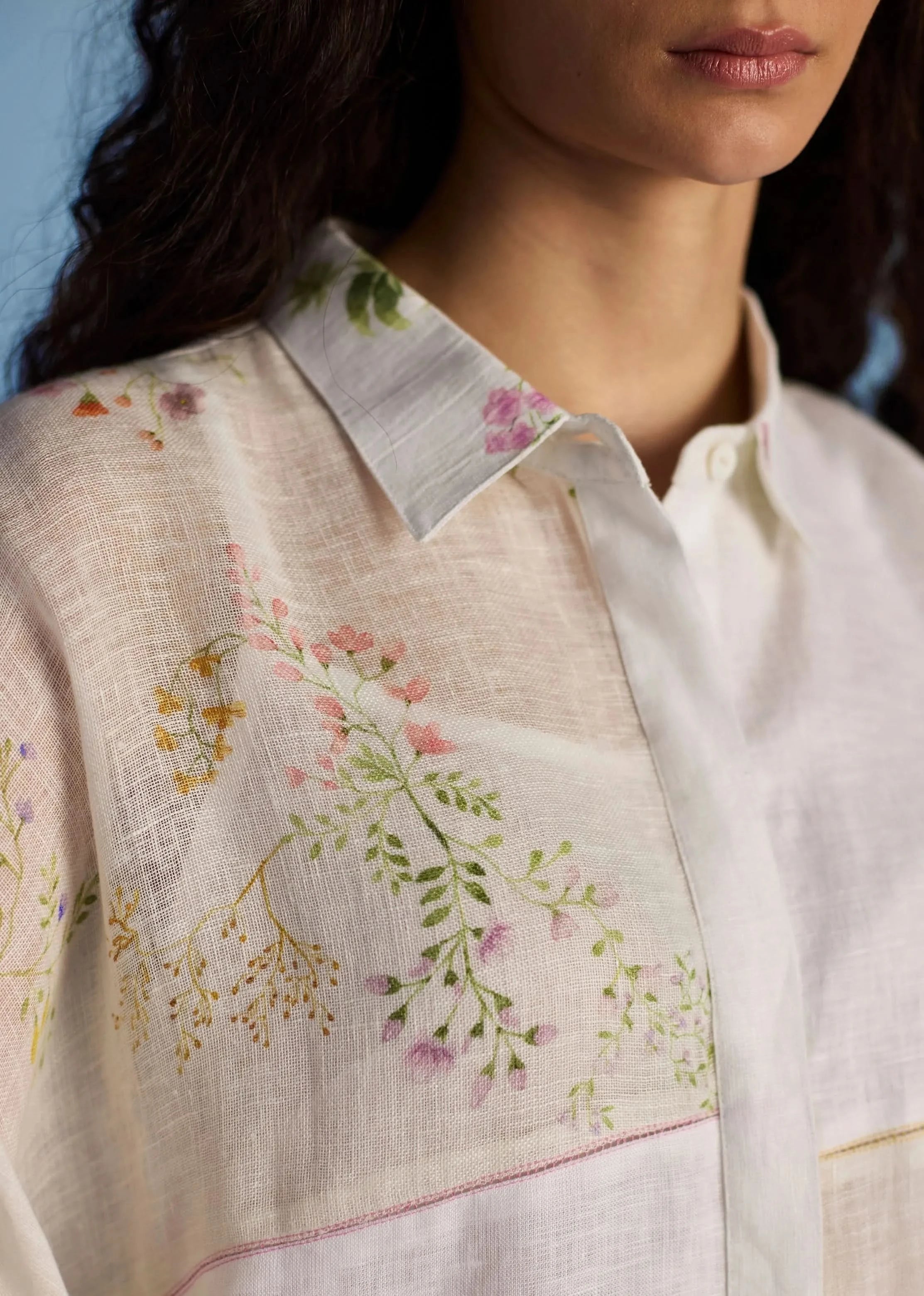 Top -A contemporary take on a kaftan shirt crafted by patching soft yarn-dyed linen and printed sheer linen; featuring hand-illustrated delicate floral prints on the sheer panels and joined with vibrant, multi-colored intricate fagotting thread details. The statement oversized shirt pairs beautifully and easily with our linen pants. It is finished with pop-coloured intricate picoting detail at the hem. Pant- Timeless linen culottes with pleats at the waistband, comfortable pockets and an soft elasticated back waistband in our signature yarn-dyed linen with a sheer linen patchwork band at the hemline with a tonal faggoting stitch detail. The Mapa pairs beautifully with everything.
