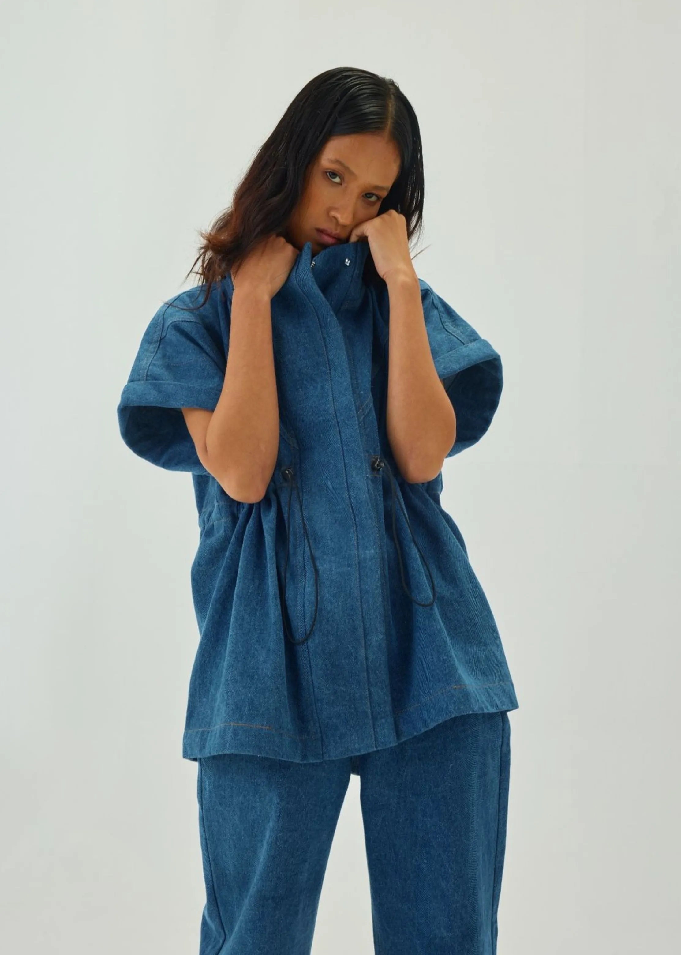 Oversized sleeveless jacket with a high stand collar, front snap-button placket along with zip closure, adjustable drawstring waist, structured seam detailing, and relaxed straight silhouette