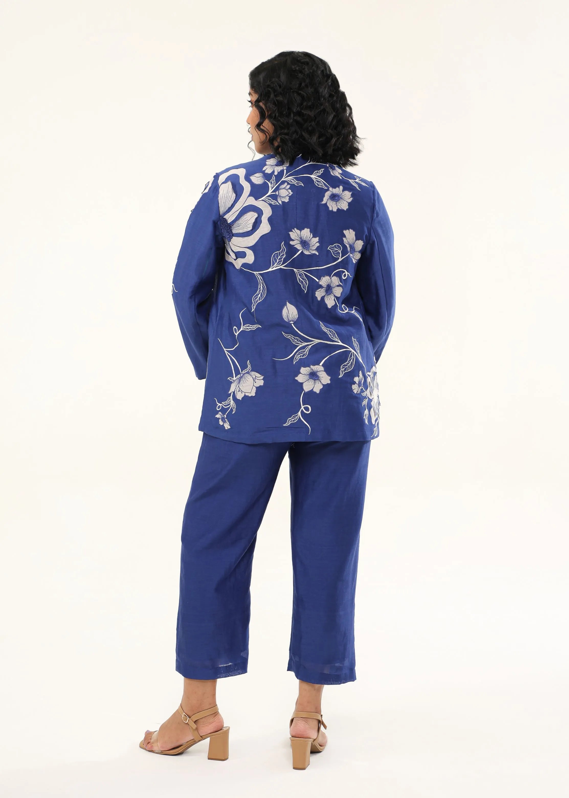 This elegant co-ord set features a comfortable sleeveless top, perfectly complemented by a fully embroidered jacket with intricate appliqué work. Paired with comfortable, embroidered pants that include convenient pockets, this ensemble combines style and practicality for a timeless look.