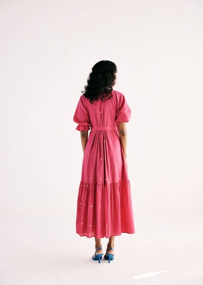 No Return No ExchangePink Polka wrap is the symphony of comfort, its silhouette layered with grace and charm adorned with classic polka print in pink crafted in cotton mul. with front tie-up opening and an elasticated sleeve hem. Polka Dress Polka printed dress Polka Dress Handcrafted in India. Fully lined body. Side seam pockets.