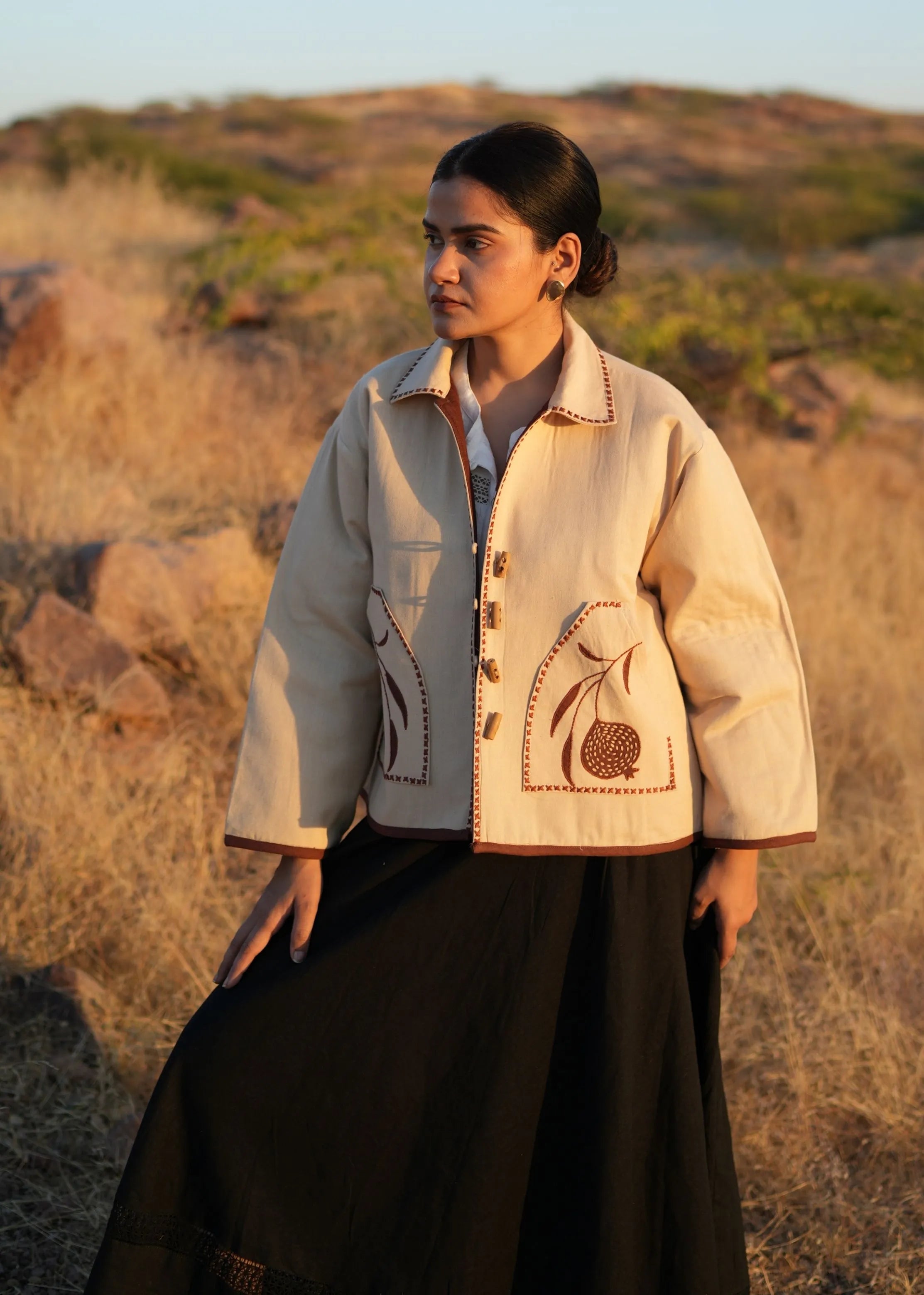 Rhyme appliqué hand-embroidered quilted jacket. It features beautiful appliqué work on both sides and hand-done cross-stitch detailing along the collar and front