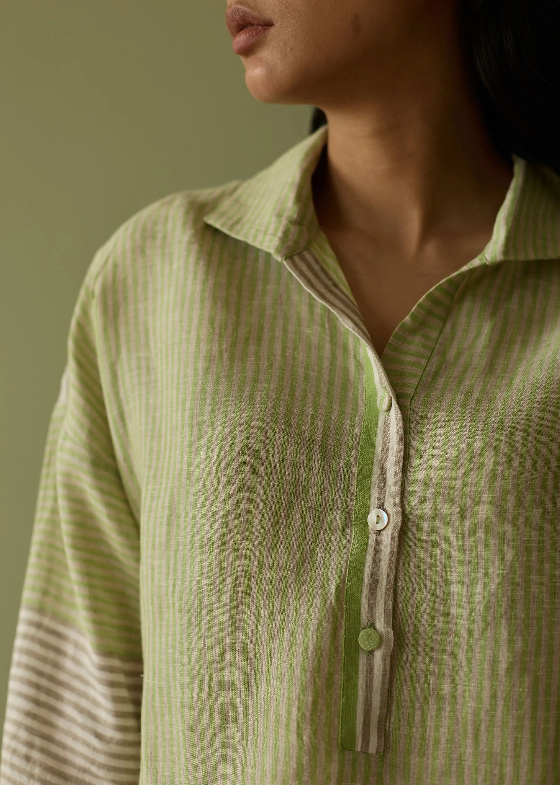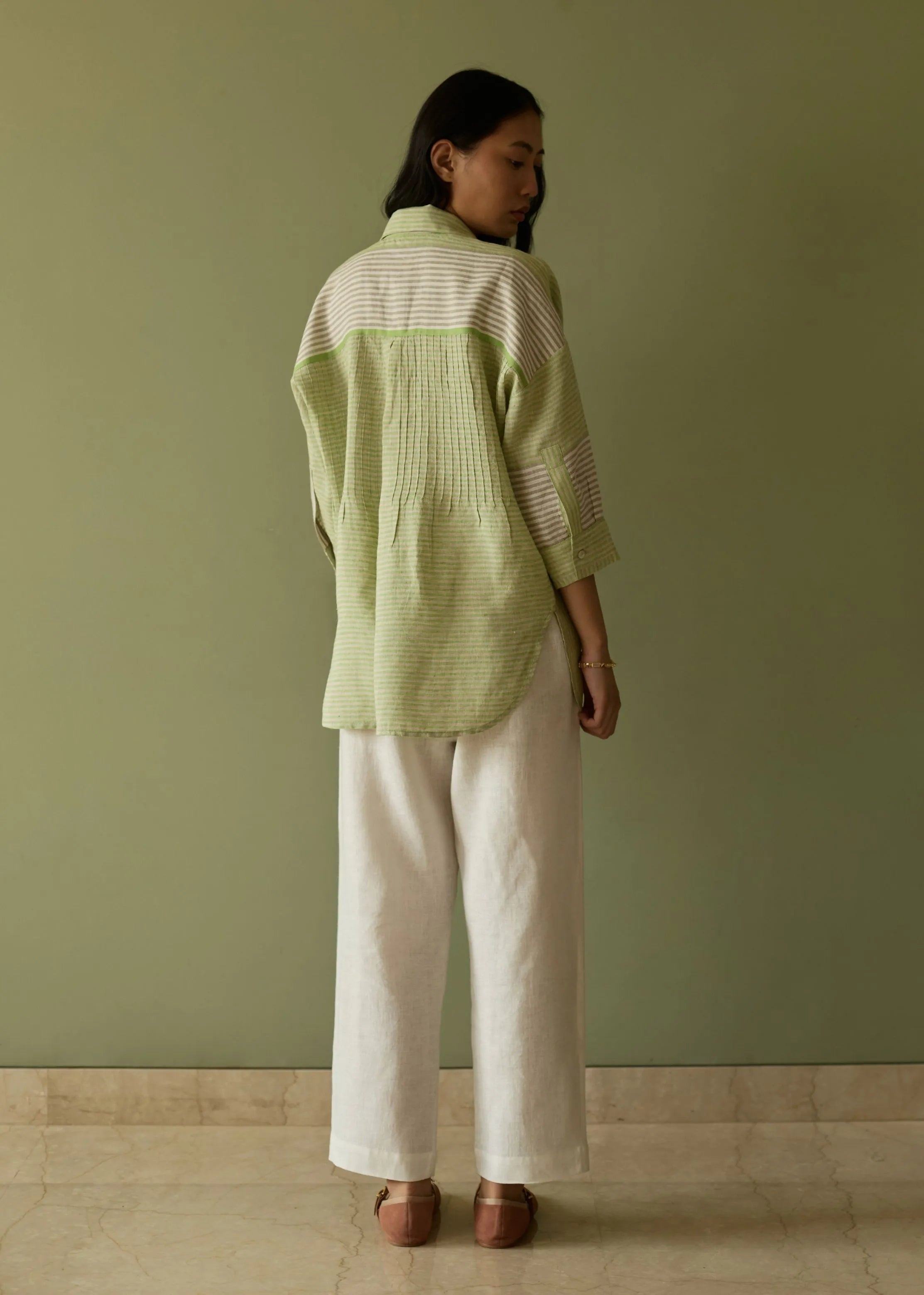 Shirt - Our favourite relaxed-fit shirt is designed in our bespoke handwoven yarn-dyed soft stripe linen in tones of green, grey and ivory. The weave is designed as a delicate, and unique multicolour stripe handwoven linen, known for its breathable texture and gentle drape. The relaxed collar and drop shoulders create an easy, effortless silhouette, while contrasting ivory woven borders on the placket, cuff and 3/4th sleeves add a subtle, shaped edge.The Risa is finished with intricate pintucks at the back and linen fabric and mother-of-pearl buttons. Pant- This relaxed tailored pleated pants is crafted in our handwoven ivory linen with a front zipper, hook opening, pockets, an elasticated back waistband for comfortable fit.