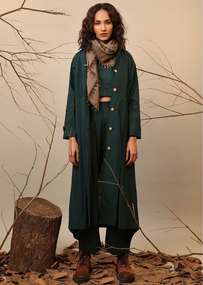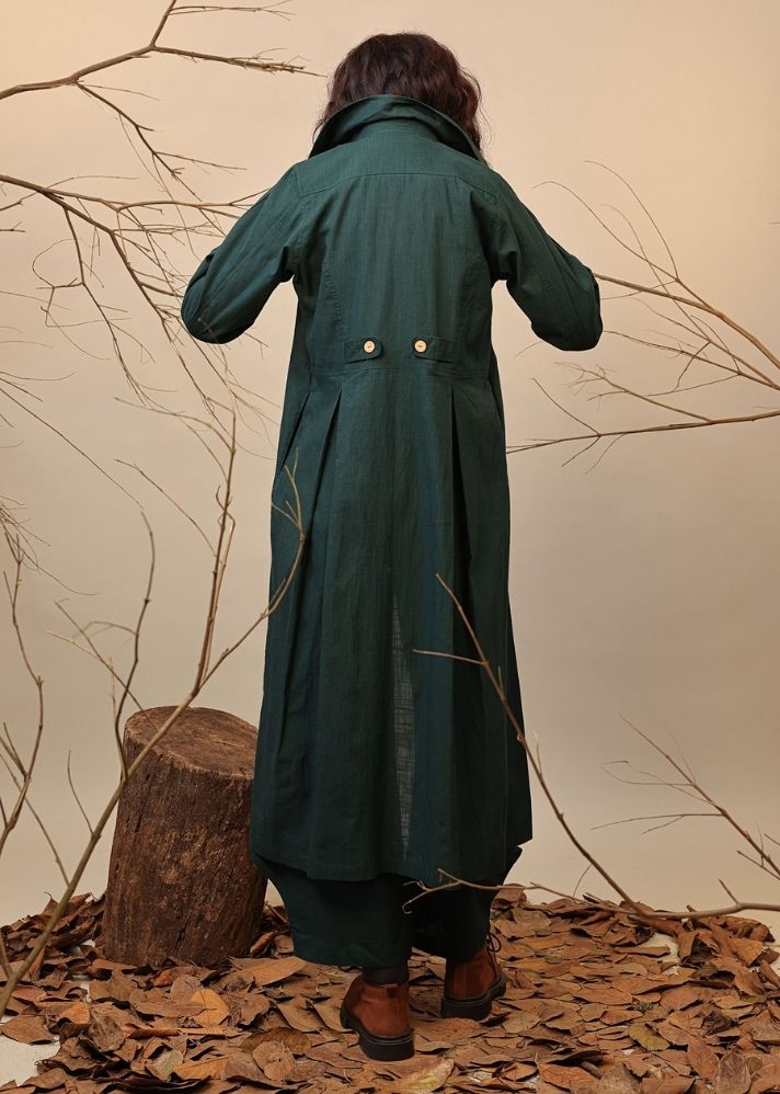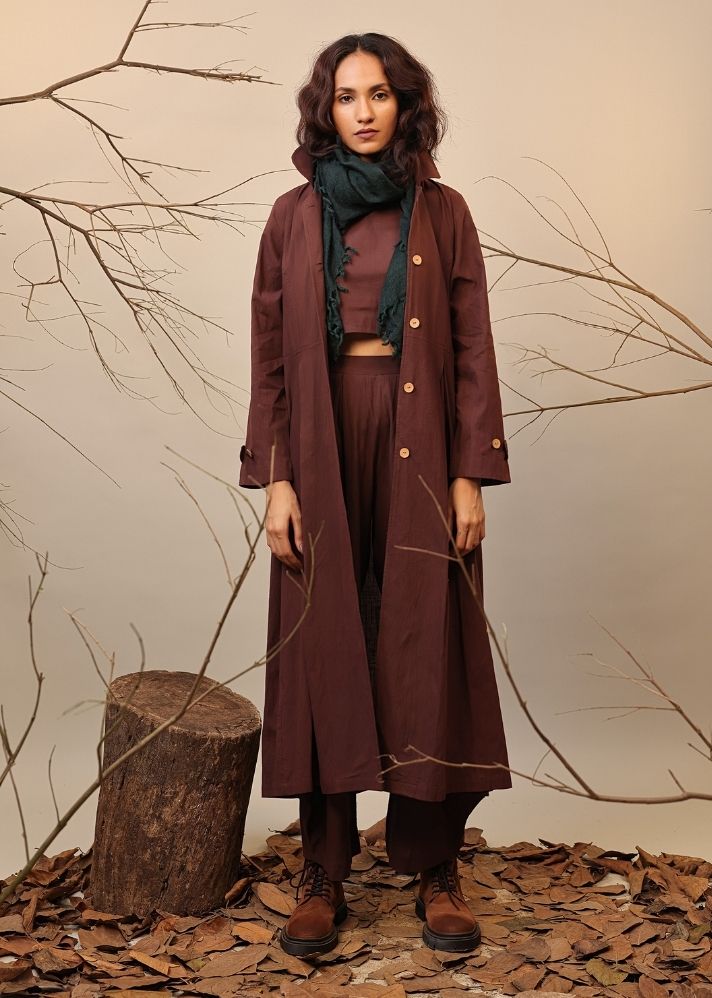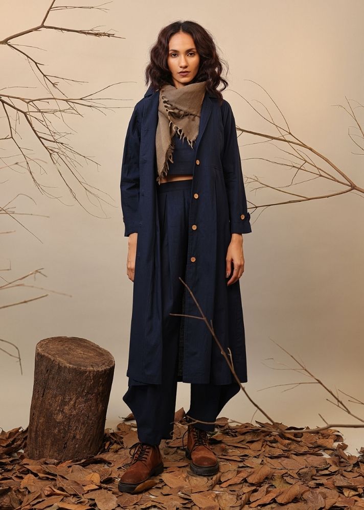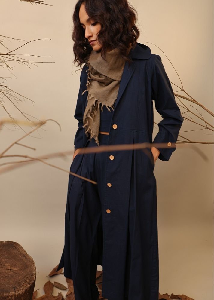 Full length jacket with peter pan collars and full sleeves with side pockets. Full button closer in the front. Layer it on any cord set from this collection or team it up with pieces in your wardrobe. A perfect travel jacket.