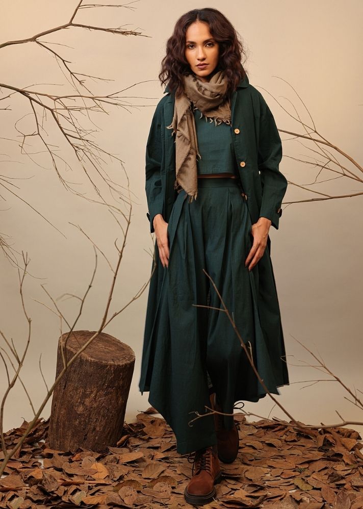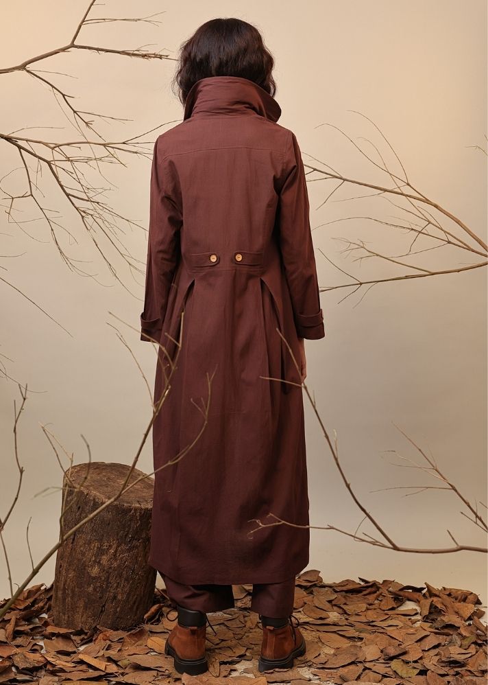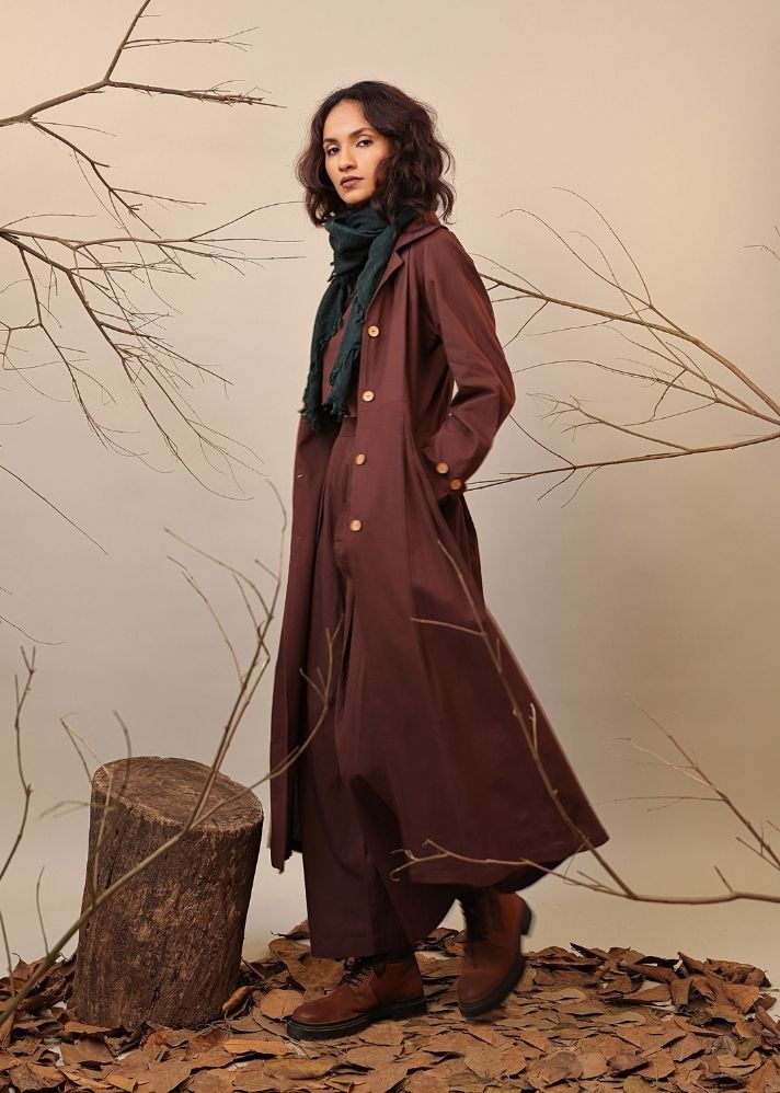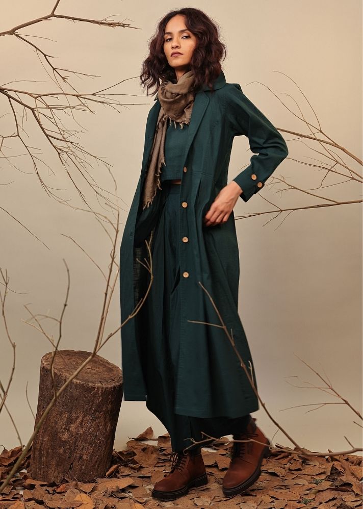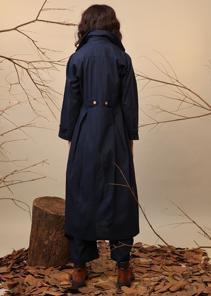 Full length jacket with peter pan collars and full sleeves with side pockets. Full button closer in the front. Layer it on any cord set from this collection or team it up with pieces in your wardrobe. A perfect travel jacket.