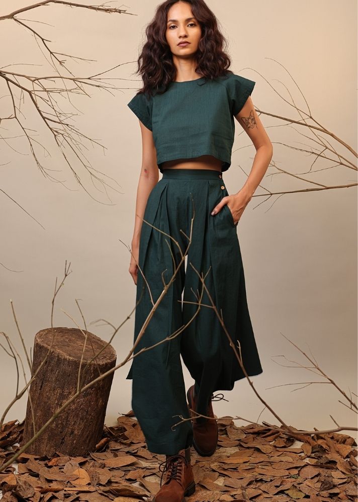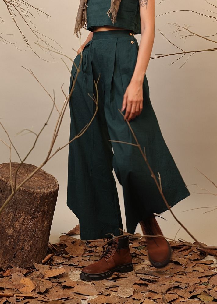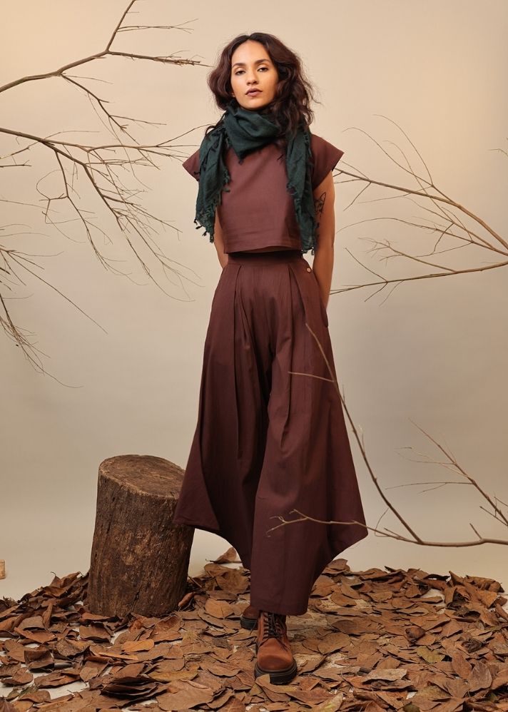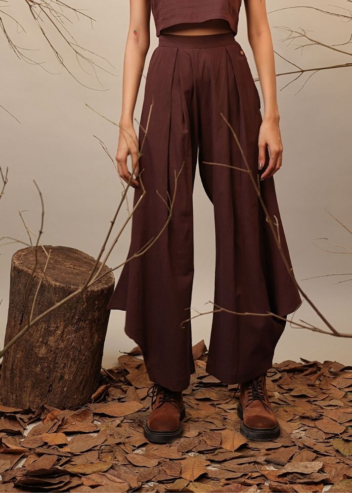 Pleated cowl pants with side button opening and side pockets. Team it with our crop top to complete the look. Adorn with the scarf from this collection for styling during winters.