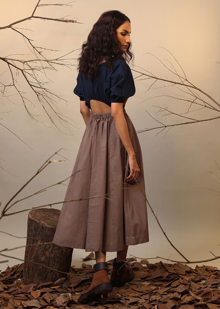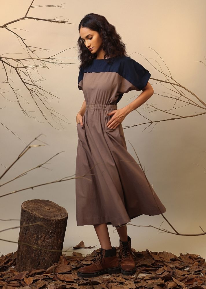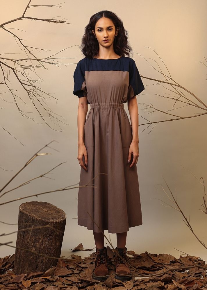 Colour-block handwoven cotton dress with a cut out back and elasticated sleeve opening with side pockets