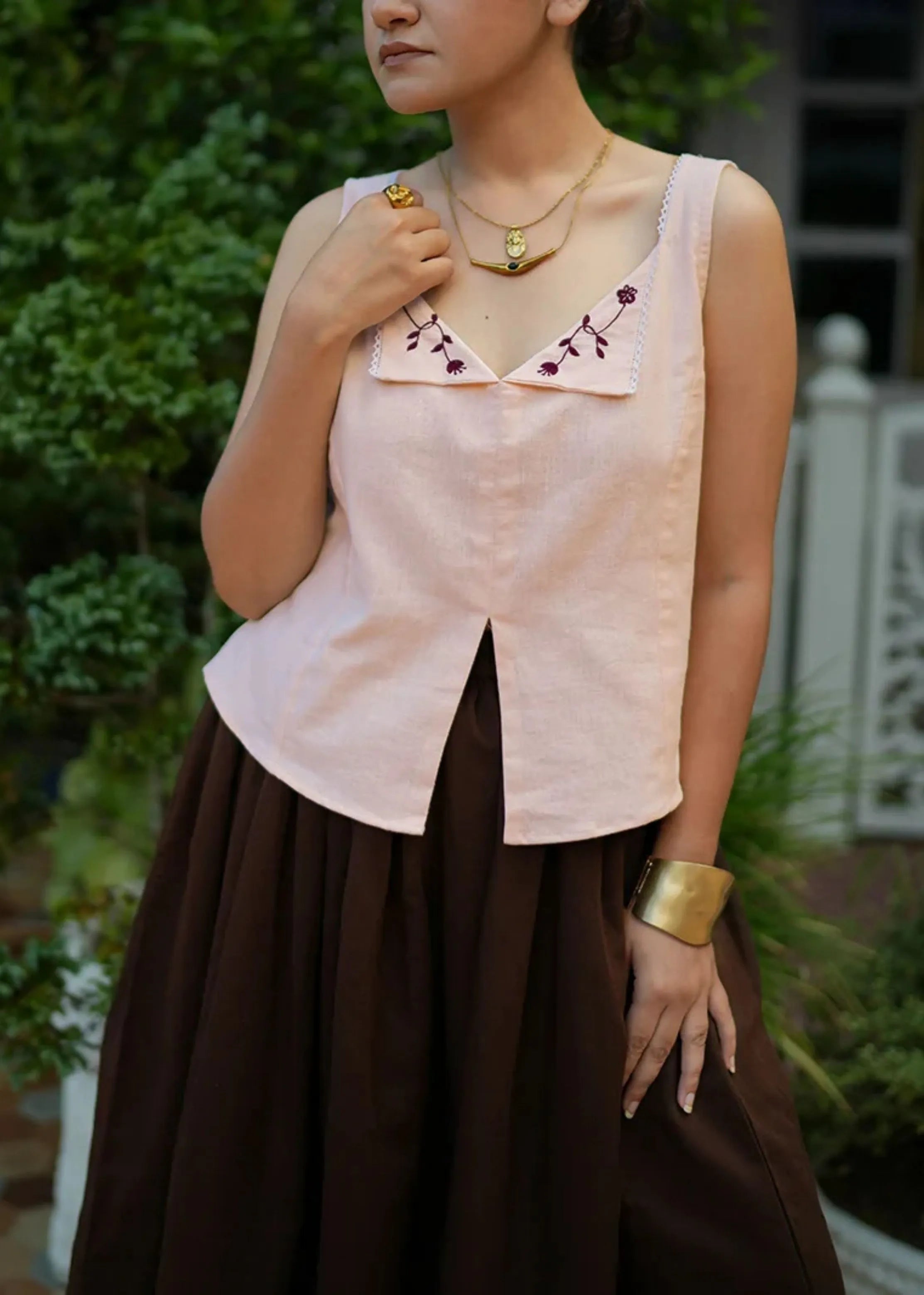 The Rose top is crafted from pure linen fabric in a soft peach color. It features beautiful hand embroidery on the neckline, complemented by delicate lace detailing.