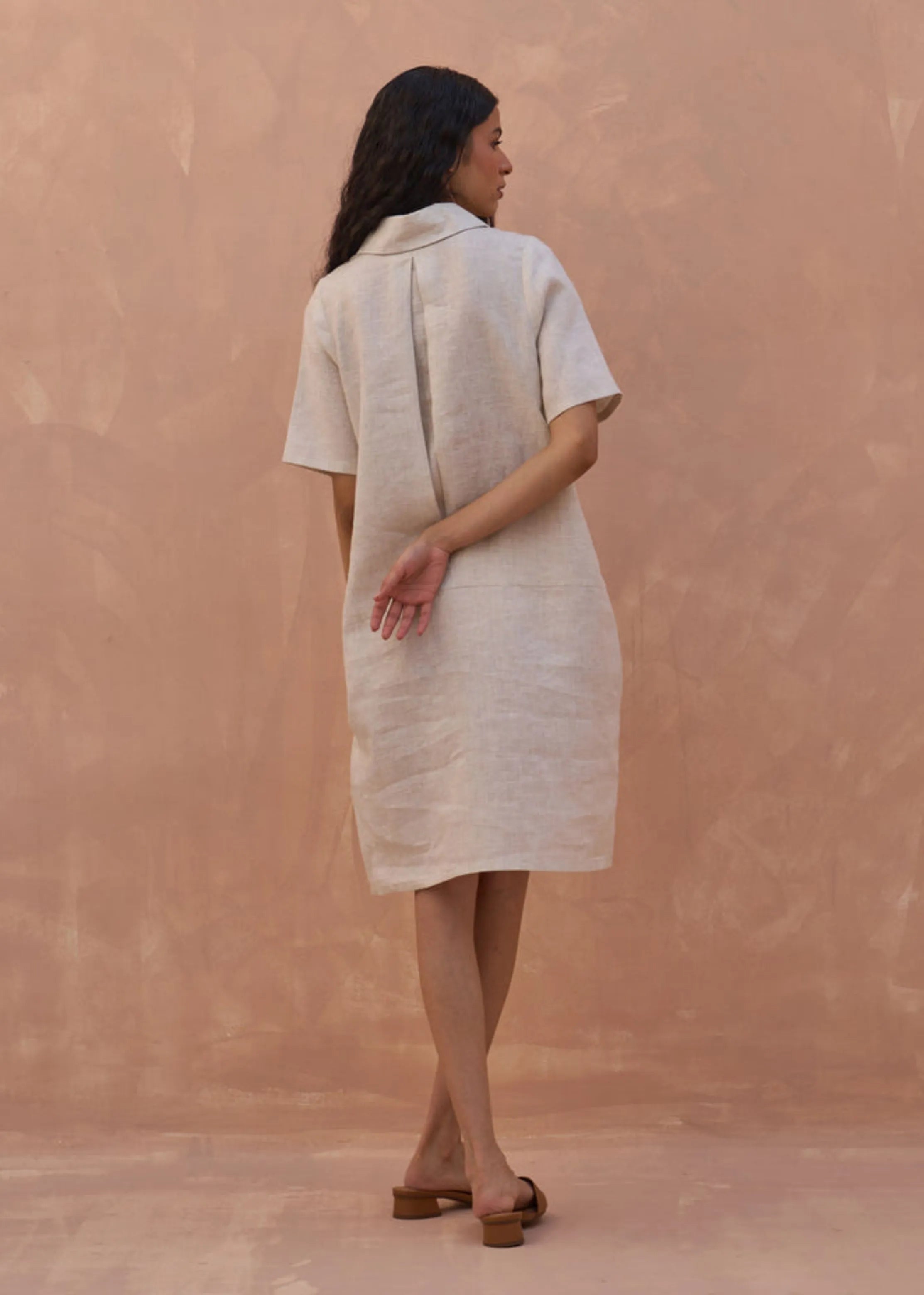 A classic linen shift dress with a shirt collar, short sleeves and a zipper.