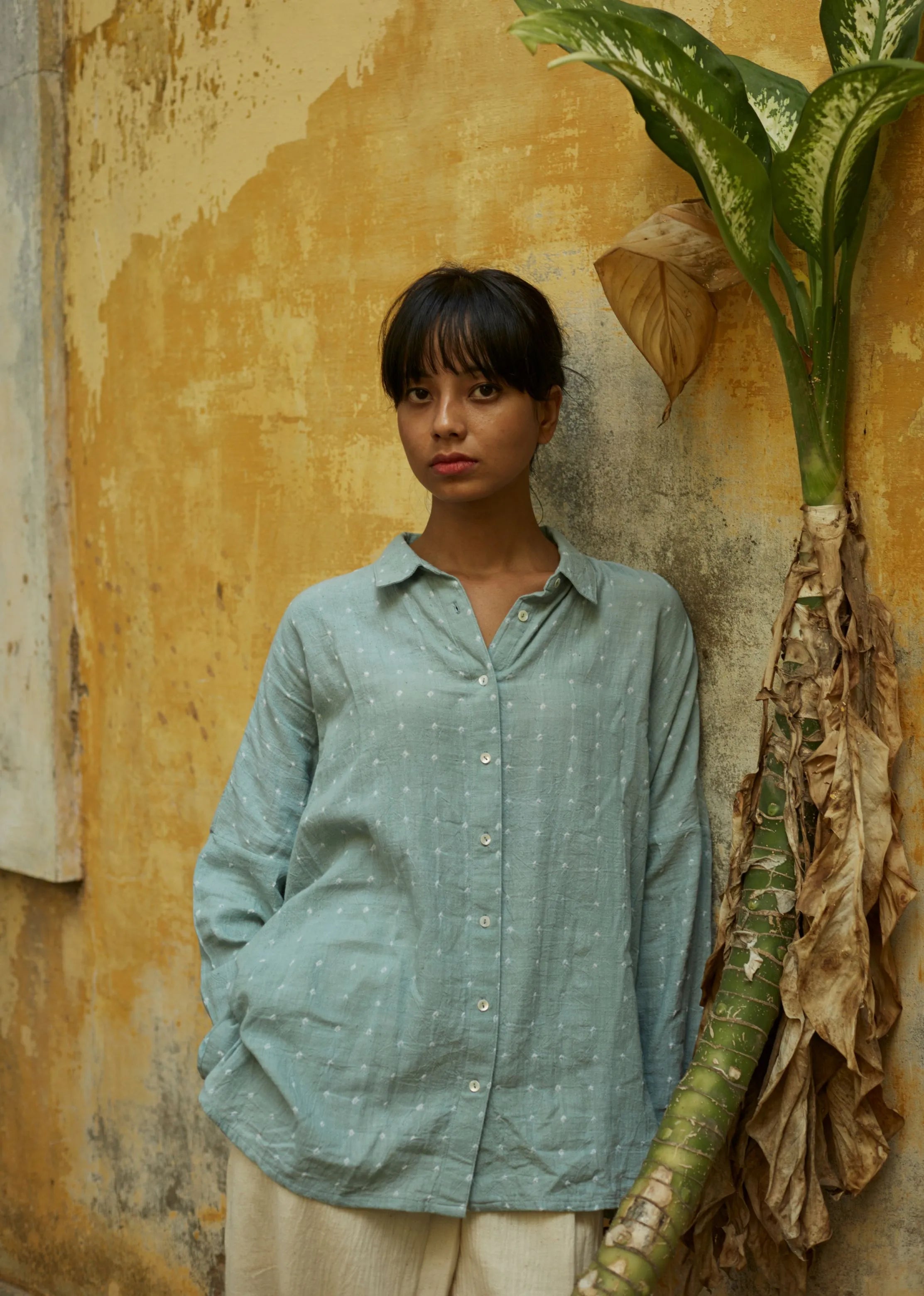 Discover the unique charm of our Sage shirt, crafted from 100% handwoven Kala cotton for a breathable and comfortable feel. This special piece stands out with a striking contrast back yoke featuring an authentic bandhani design. The intricate Bandhani tie-dye work was skillfully done in Bhuj, Gujarat, a testament to traditional Indian artistry. Following this, the garment was meticulously dyed with Azo-free dyes in Bengaluru. Handwash separately, dry inside out in shade, Steam iron on medium low heat Or Dryclean
