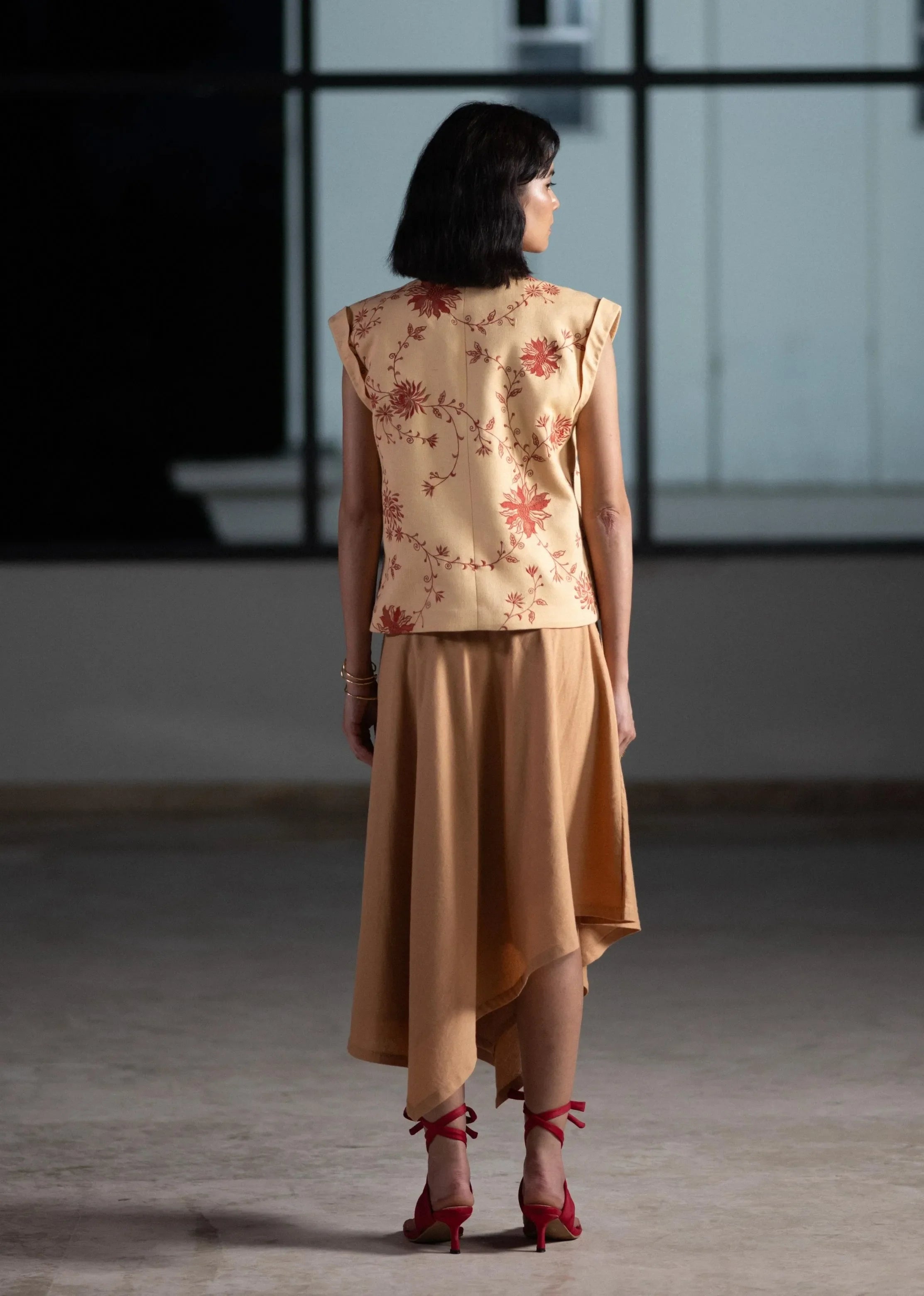 Sand brown high-low hemline skirt crafted in cotton linen with voile lining. The asymmetrical cut creates a chic drape effect, ensuring a stylish and sophisticated look. The skirt features a convenient side zipper and hook closure for easy wear.