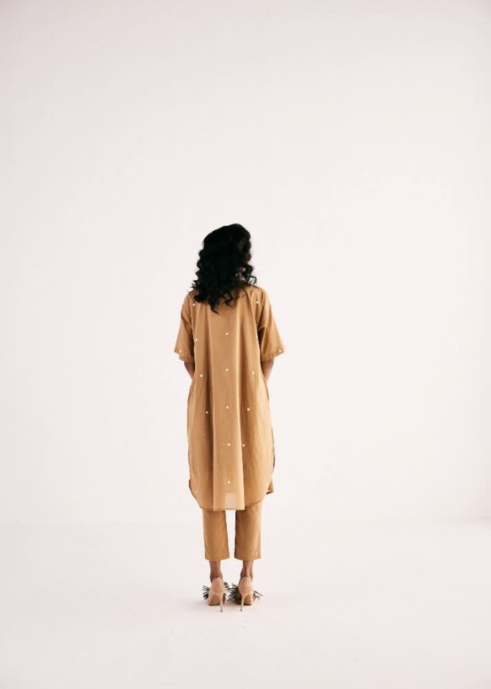 No Return No ExchangeA Sand polka dot printed kurta with front button opening crafted in soft cotton mul paired with cotton mul pencil pants with elasticated back and front zipper opening with a button fastening. Kurta Set, Pants Handcrafted in India. Fully Lined Side seam pockets