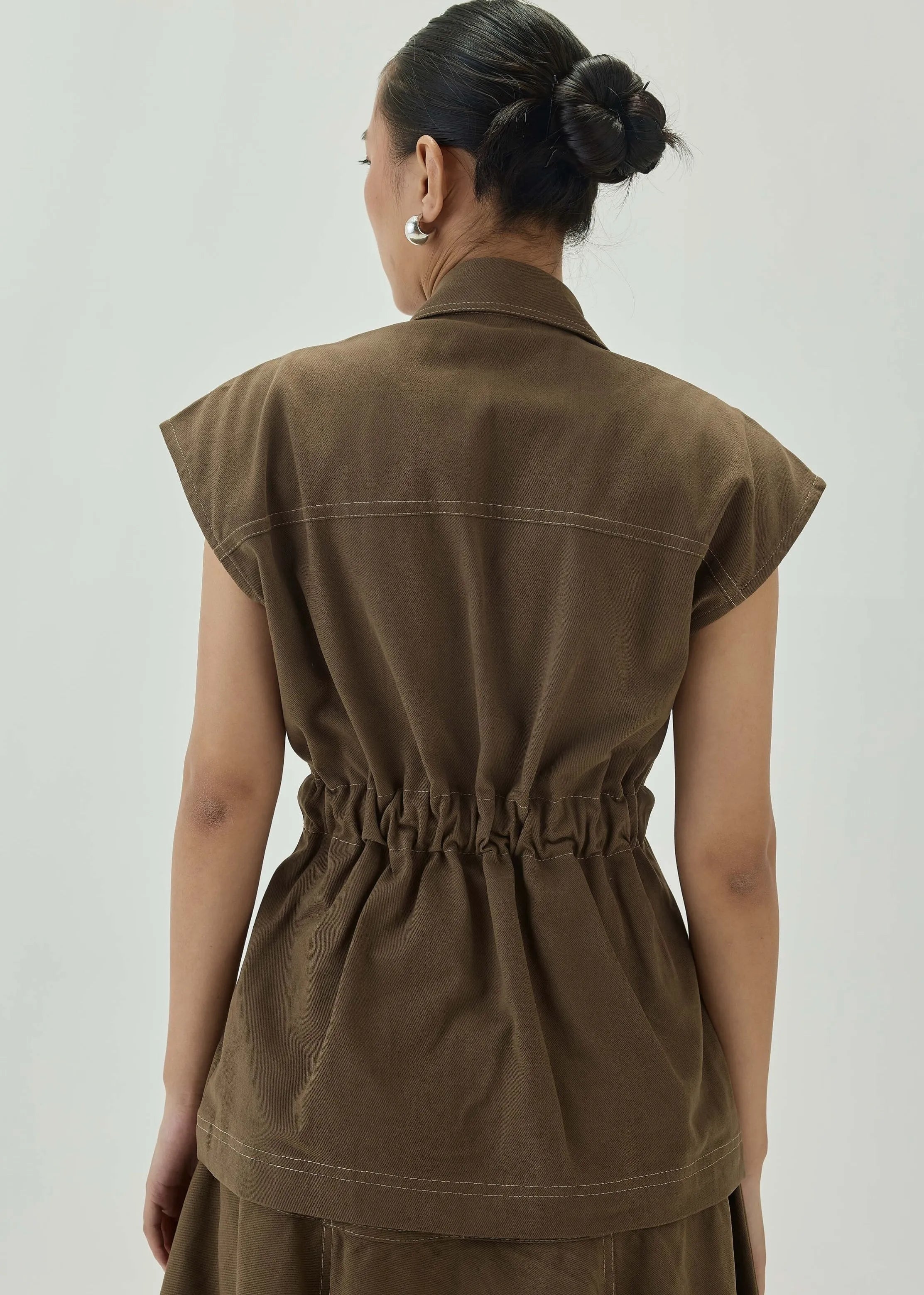 Green sleeveless shacket with a collared neckline, front button closure, contrast stitching, flap pockets, and a belted waist for a defined fit